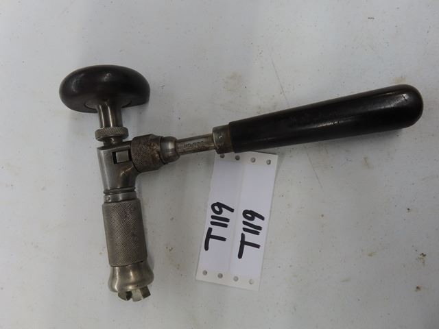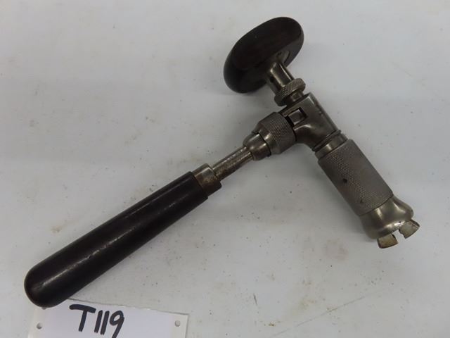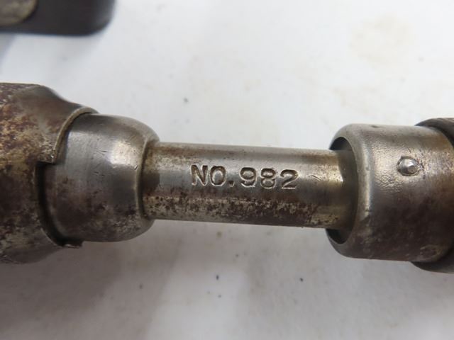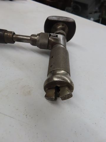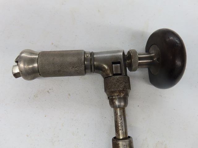 Antique Vintage No.982 ratcheting corner hand brace tool. Made by Stanley, New Britain, Conn. Measures 10" x 7" from chuck to palm handle. Complete functional brace with some soiling, stains, surface rust, some plating finish loss and wear marks.