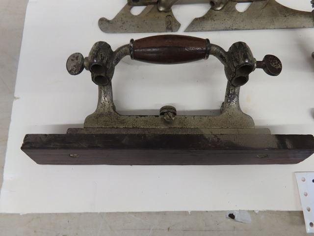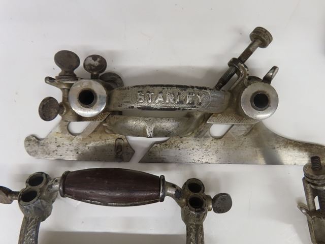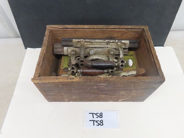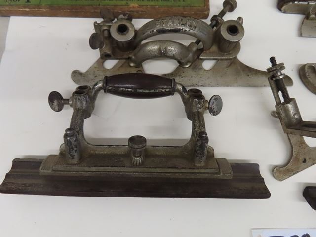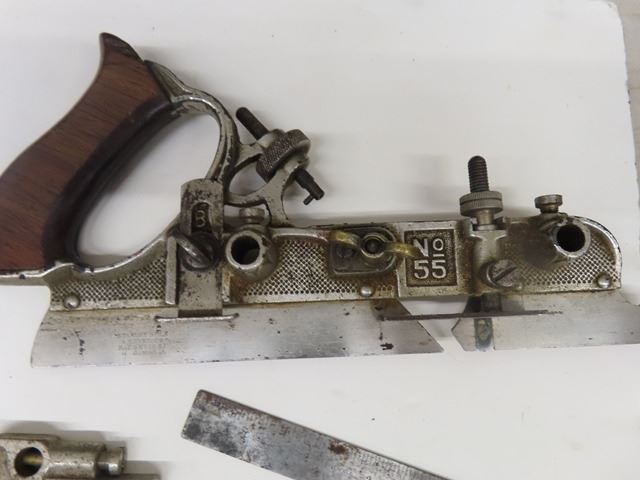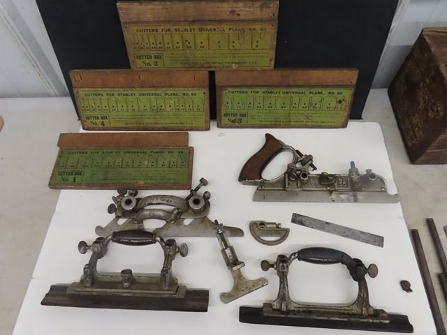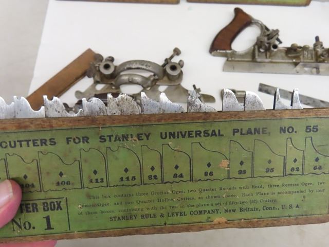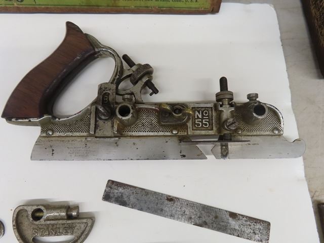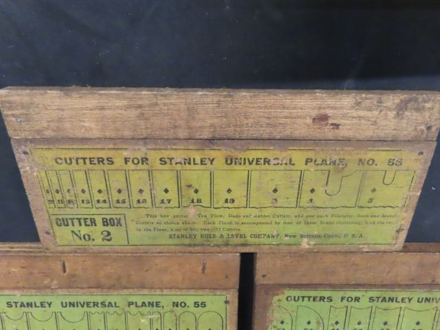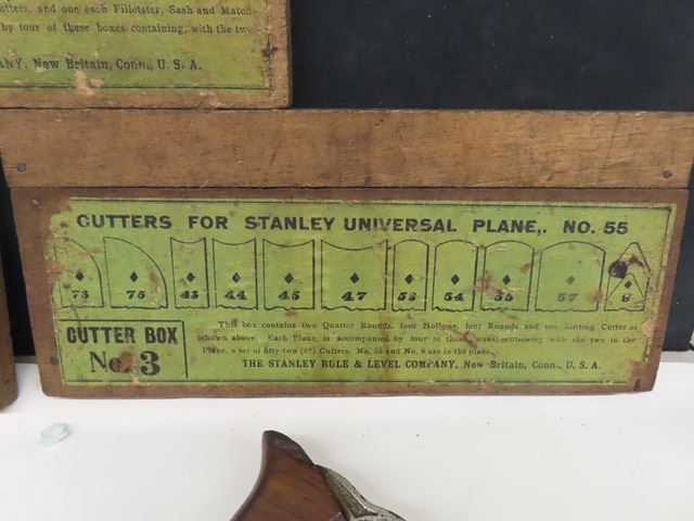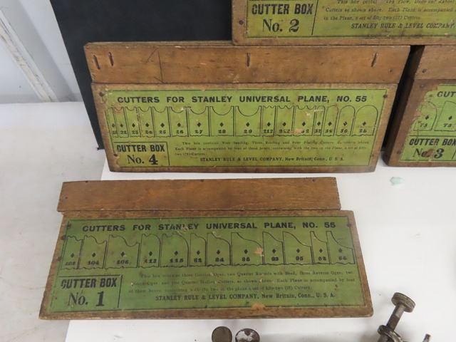 Antique Vintage Stanley No. 55 Universal Combination Plane with box + 4 cutter boxes - COMPLETE! Patent dates are Sept 19-1893 and Jan22-1895. Original box but the top has been replaced with plexiglass. Complete set of 4 boxes of cutters - none missing. Some plating missing + small amount of rust. What a beautiful tool!