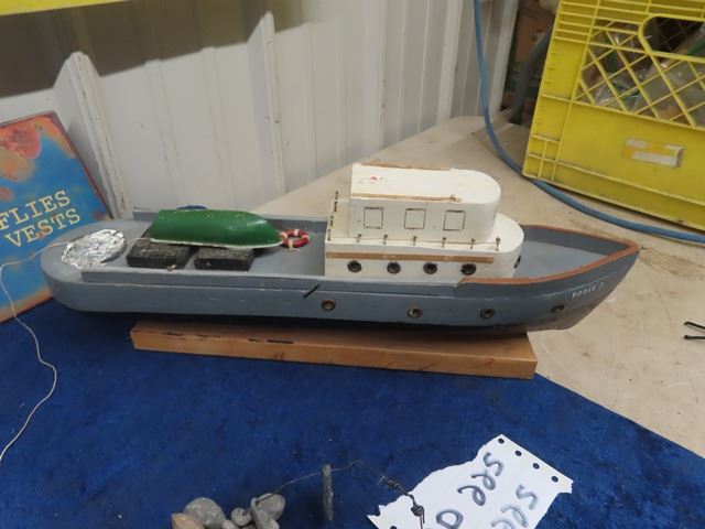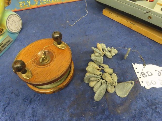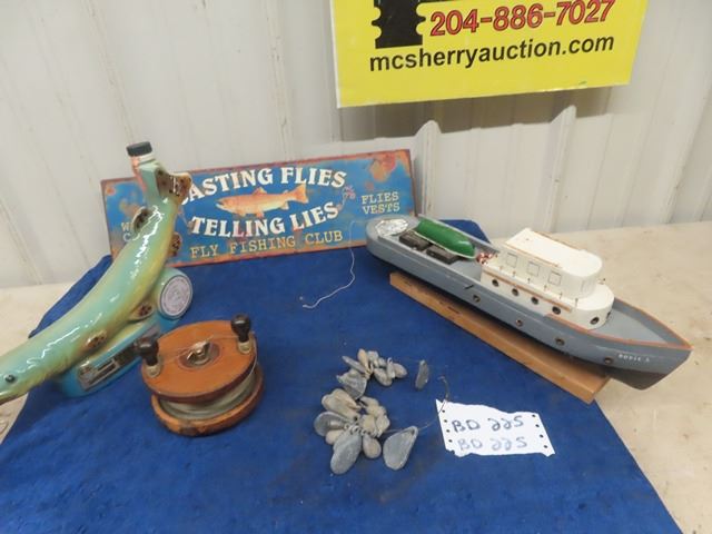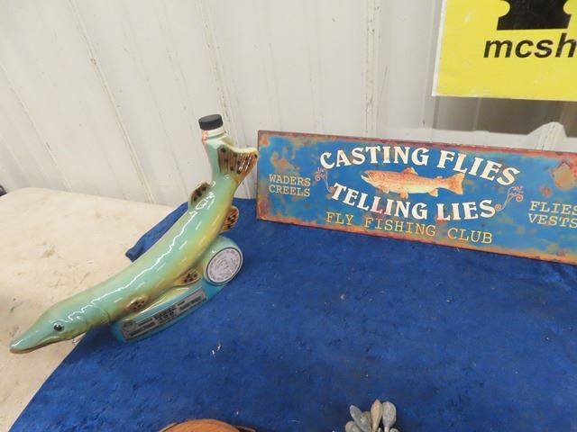 Antique Wooden Fishing Reel, Antique FIshing Weights (unique shapes), Fly Fishing Sign, Jim Beam 'Pike" Decanter & Folk Art Wooden Boat 17" Long