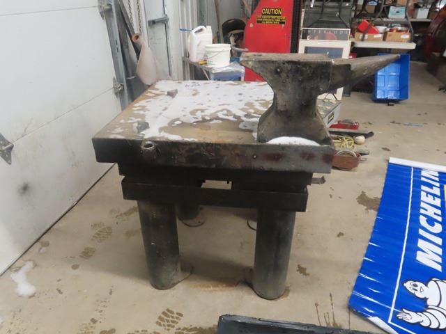 Approx. 150 lbs Anvil attached to a heavy Duty Metal Shop Table 35" high 34" x 34" anvil - 11" high 20" Length 7.5" Depth at base