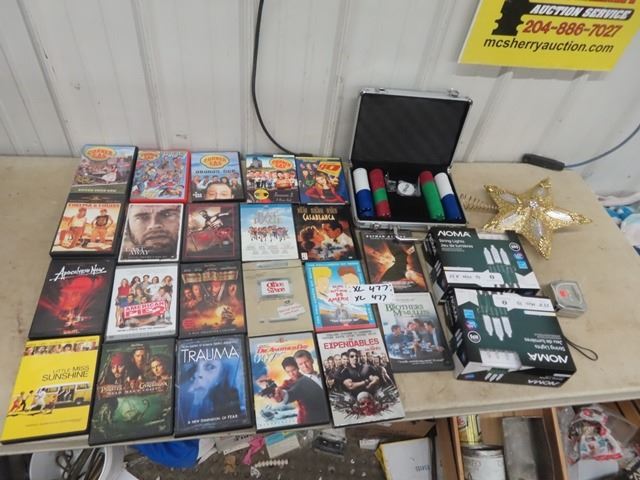 Approx 22 DVD Movies, Poker Chips in Locking Case- New Christmas Lights & Star