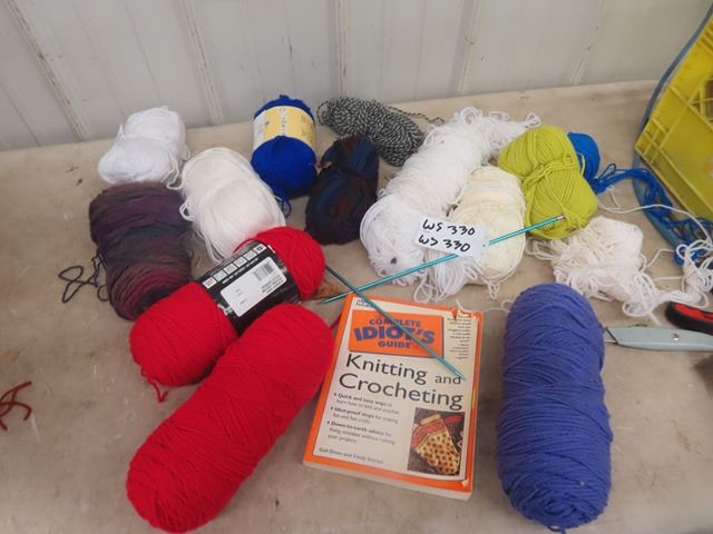 Approximately 10 Knitting Yard Skeins, Book & Needles