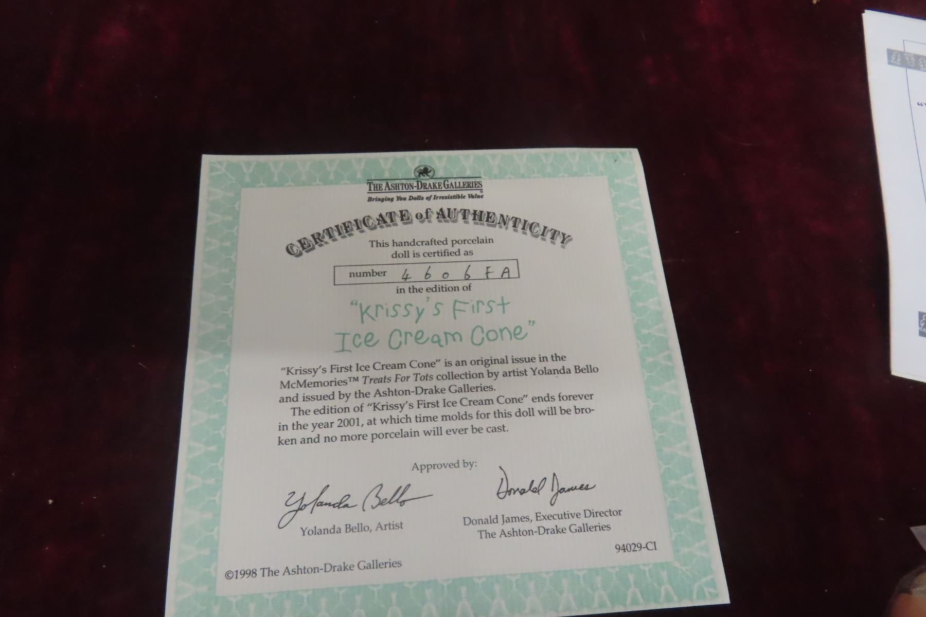 Ashton-Drake Galleries “Krissy’s First Ice Cream Cone,” 12", 1998, with Box and Certificate