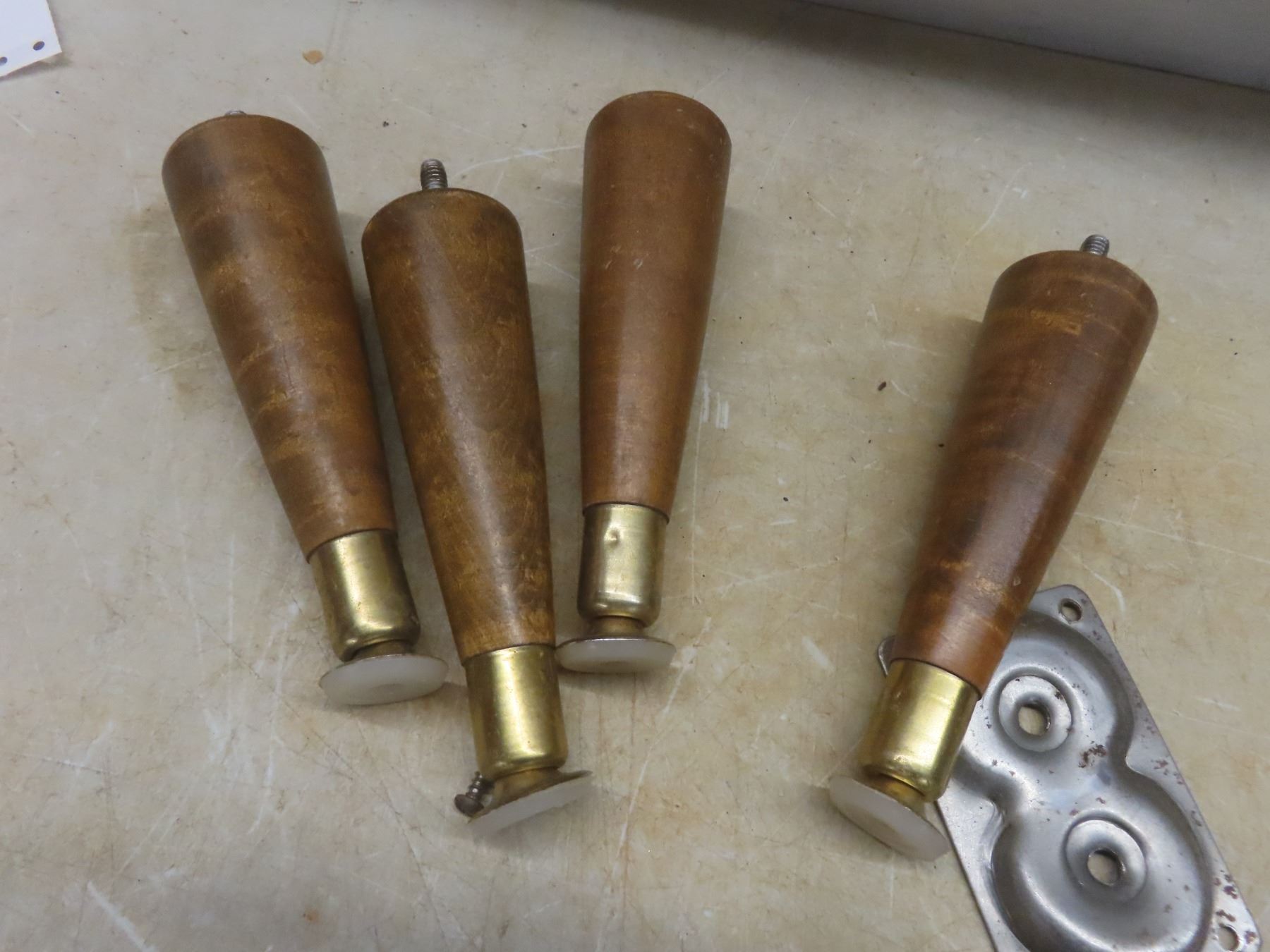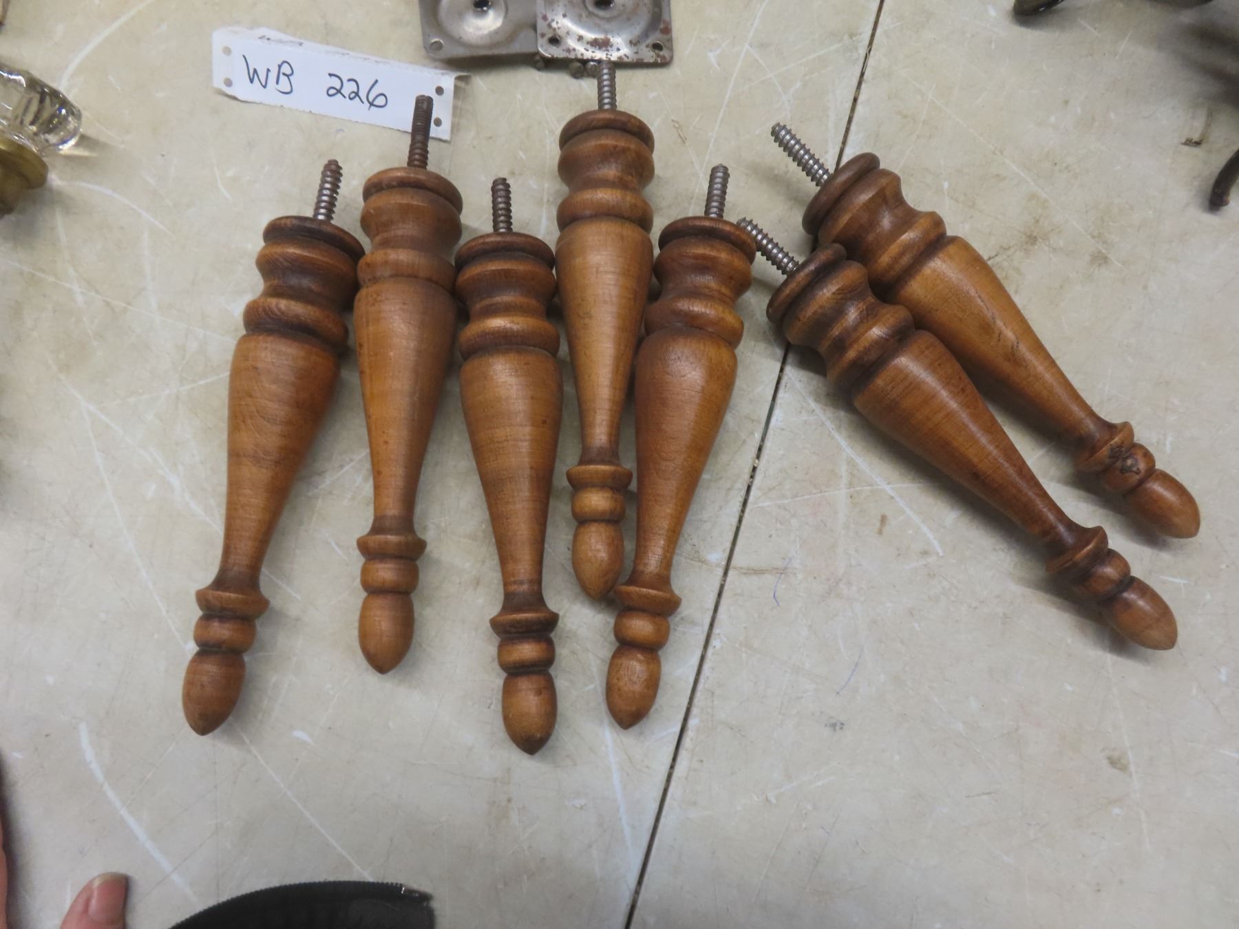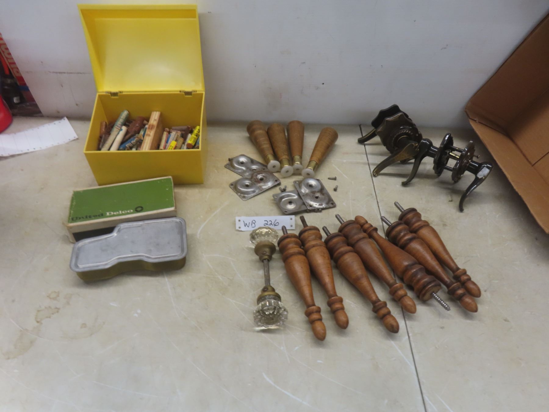 Assorted Antique Furniture Hardware Including Finials, Glass Knobs, Doorbell, and Wood Legs