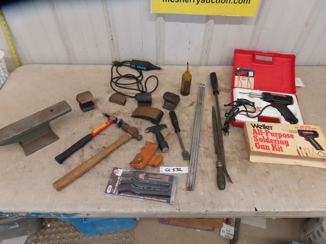 Assorted Auto Body Wedges, Hammers, Pry Bars, Anvil Engraver, Soldering Gun