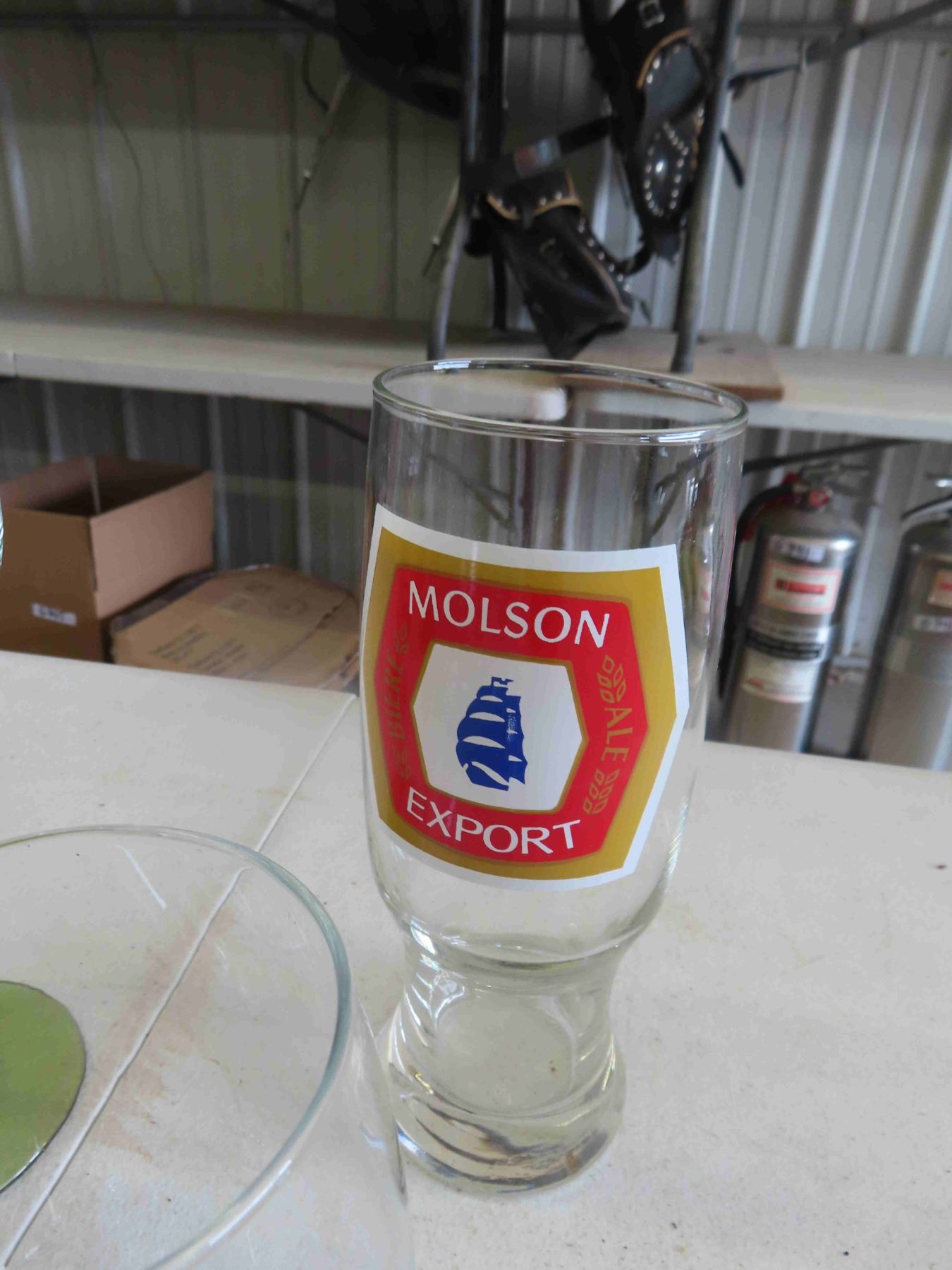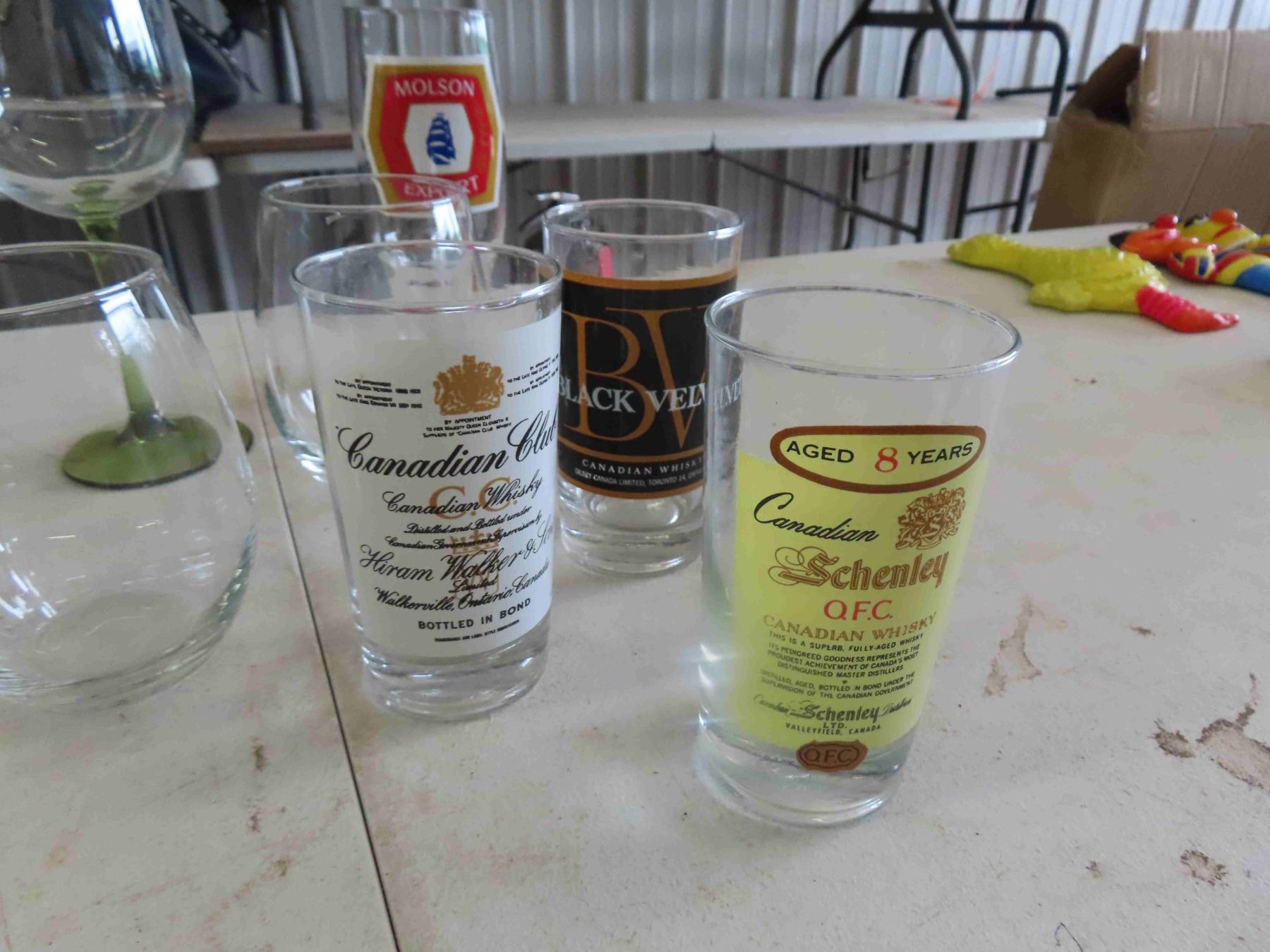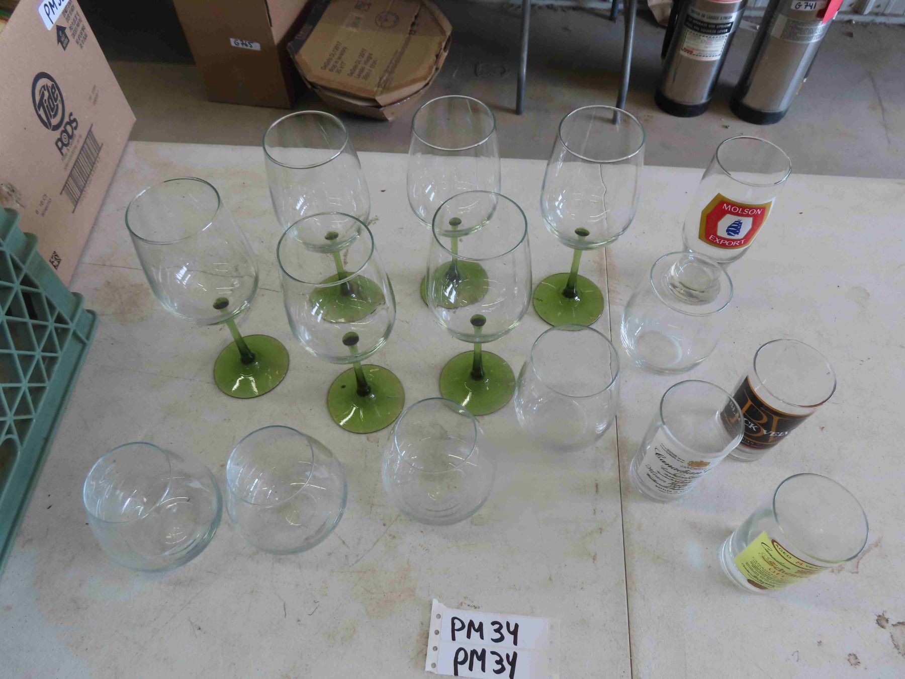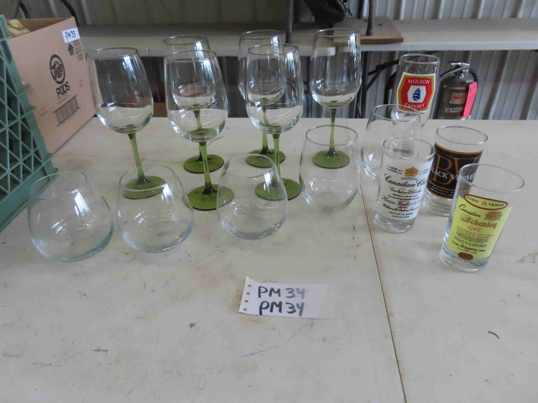 Assorted Barware - 6 Stemmed Wine Glasses, 5 Clear Glasses, 3 Glasses with Liquor Advertising, Molson Beer Glass