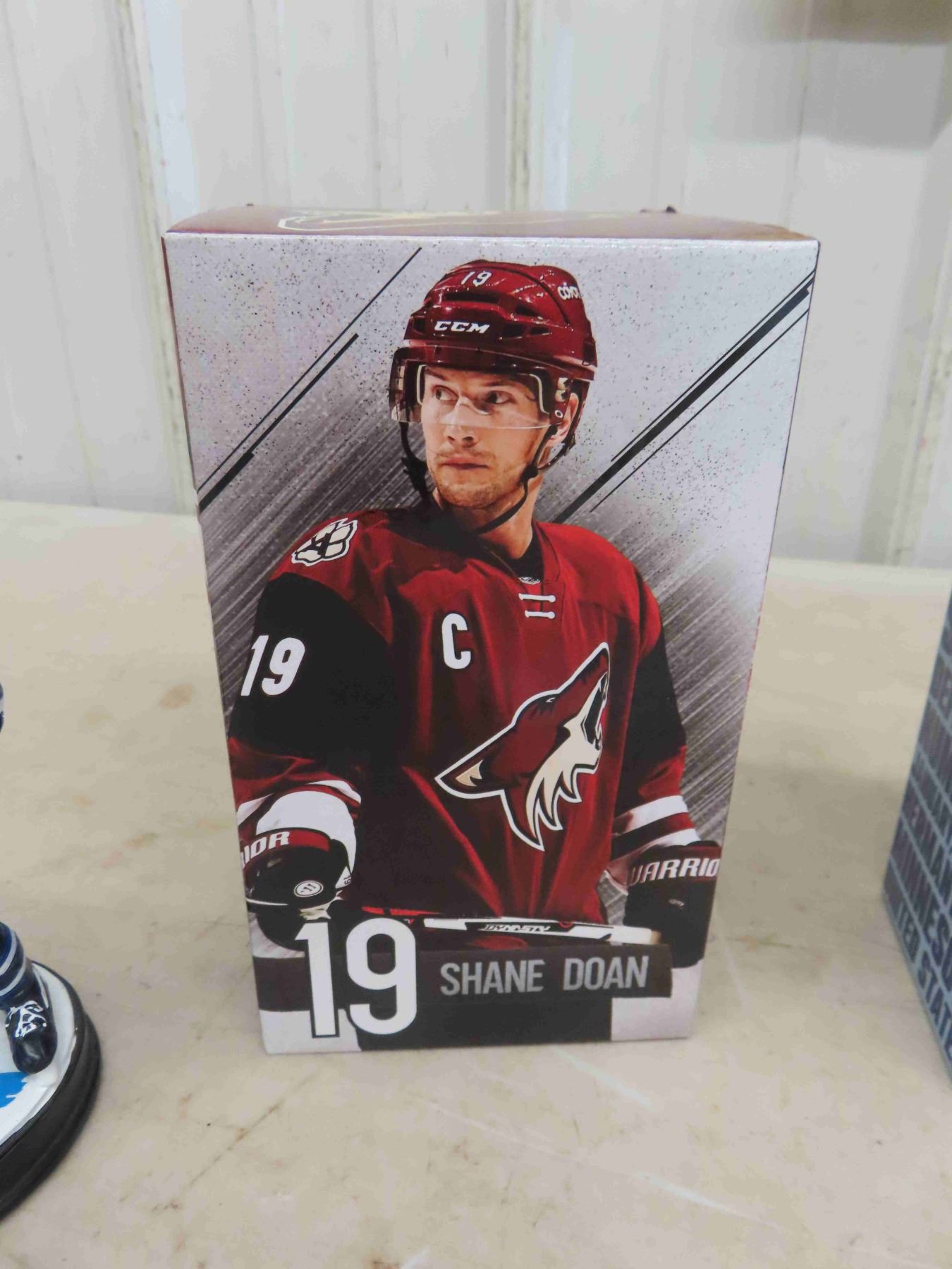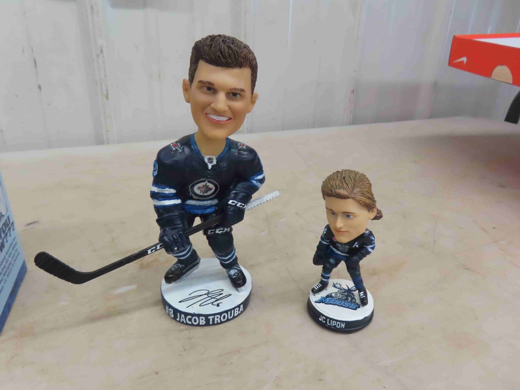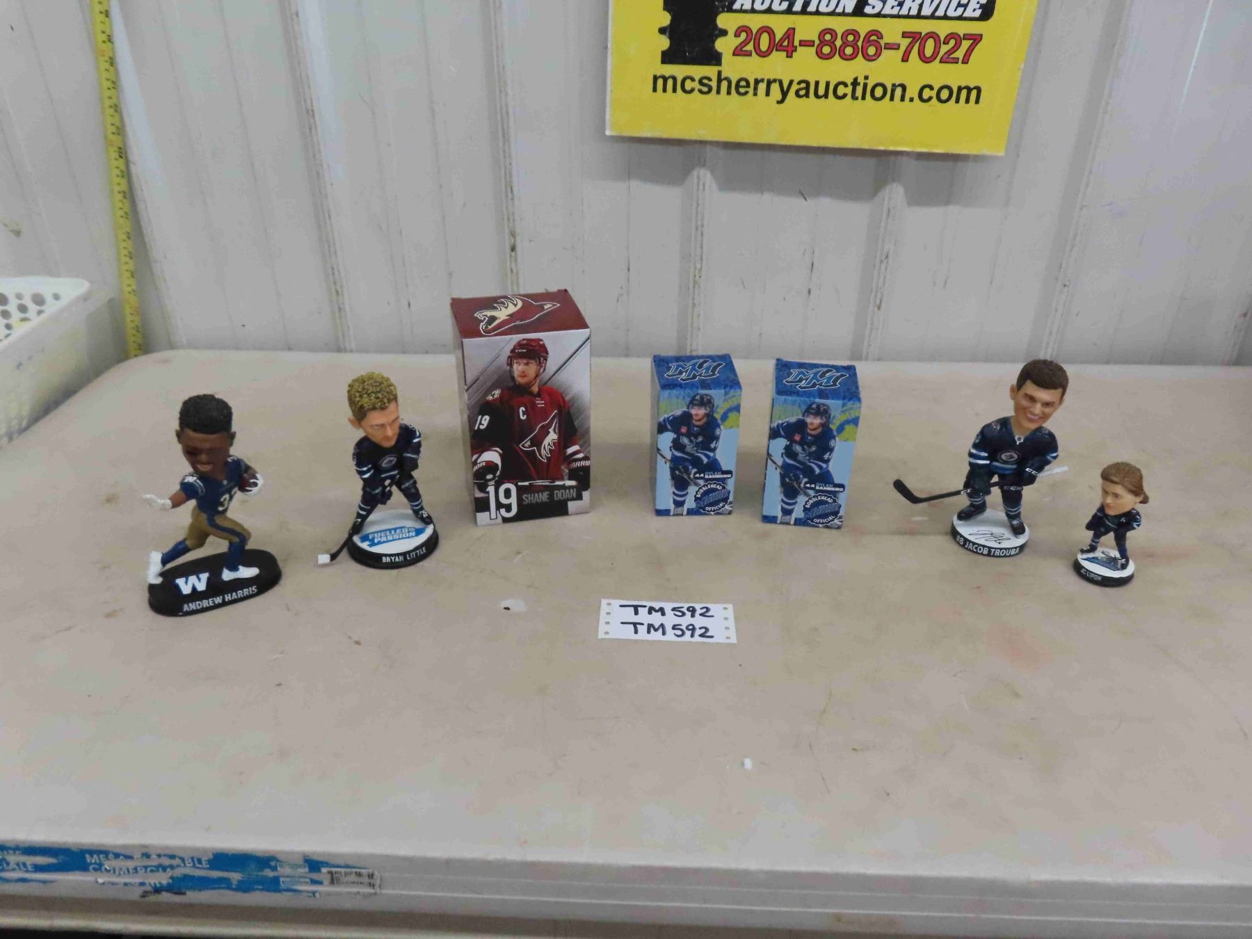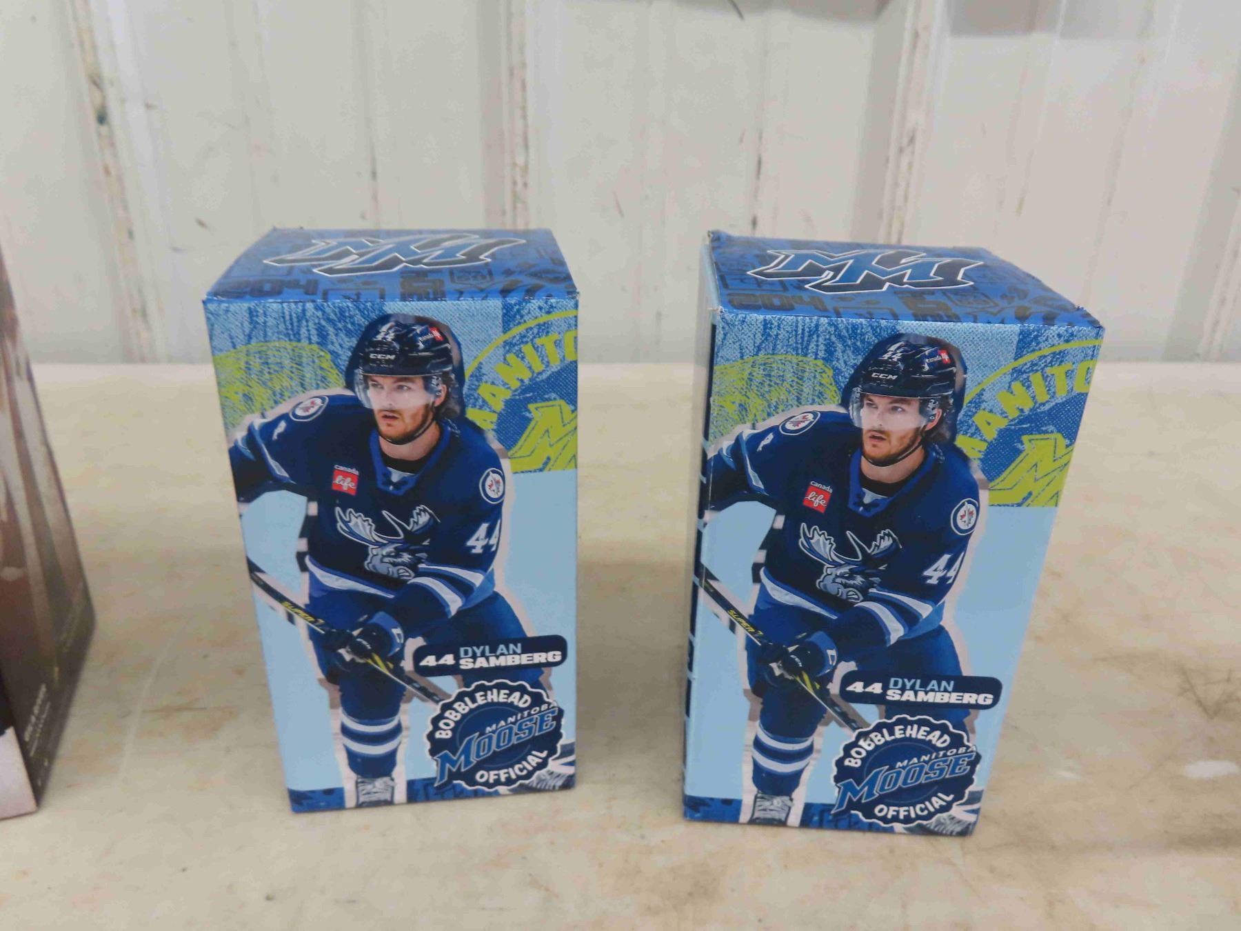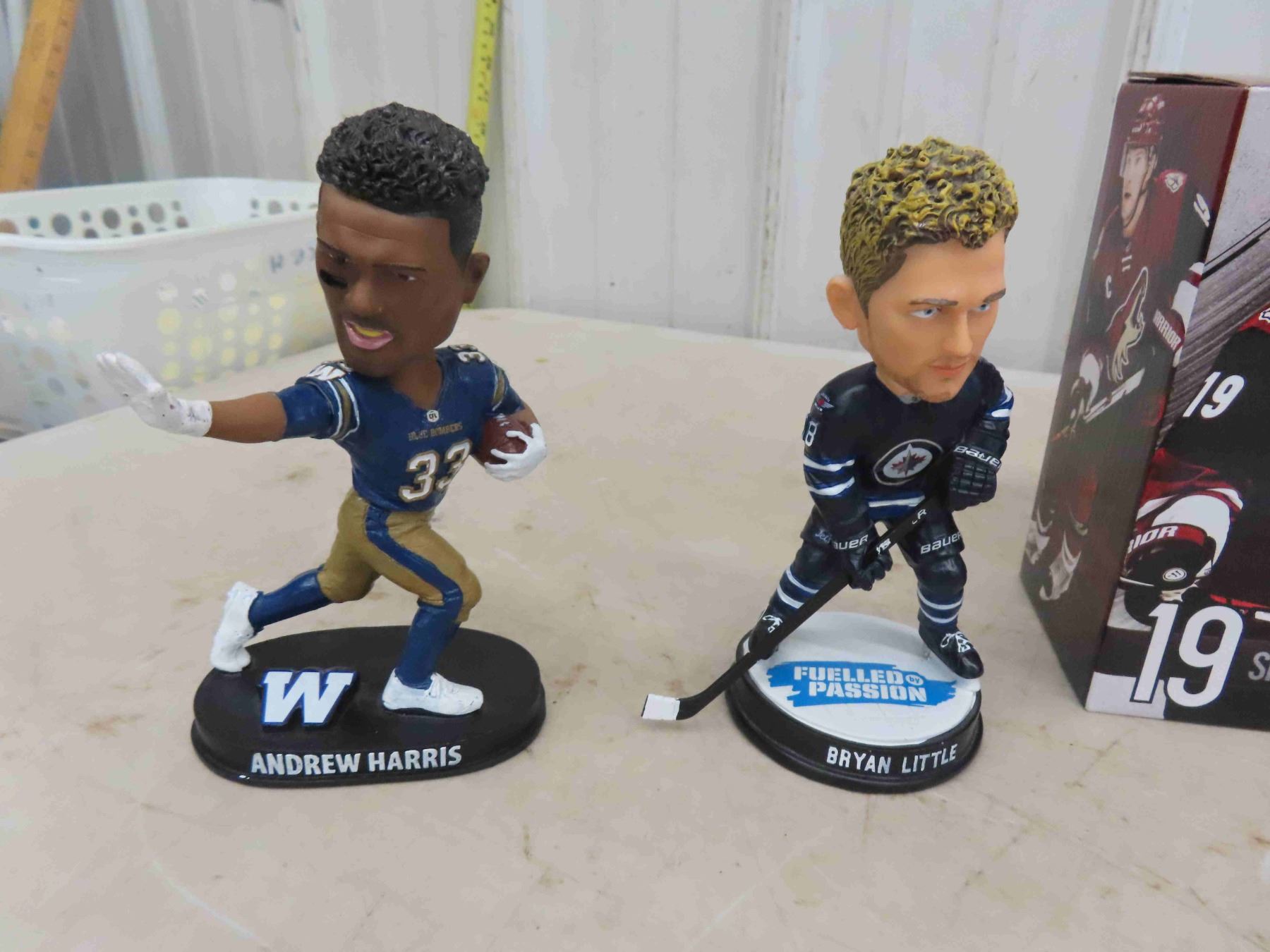 Assorted Bobbleheads ; Andrew Harris, WPG Blue Bombers, Bryan Little, Jacob Trouba WPG Jets, 2 Boxed Dylan Samberg MB Moose, Shane Doan Boxed Phoenix Coyotes