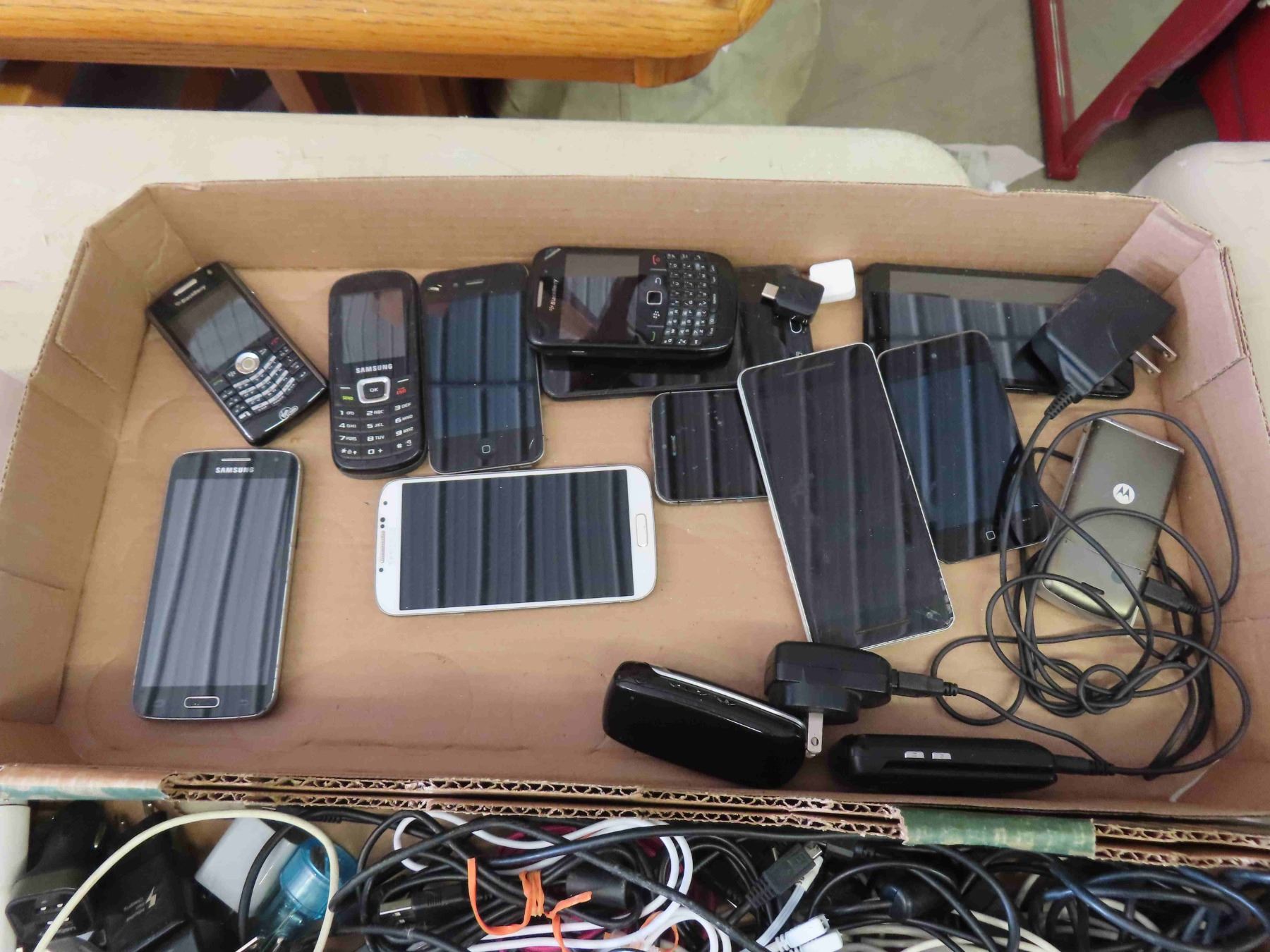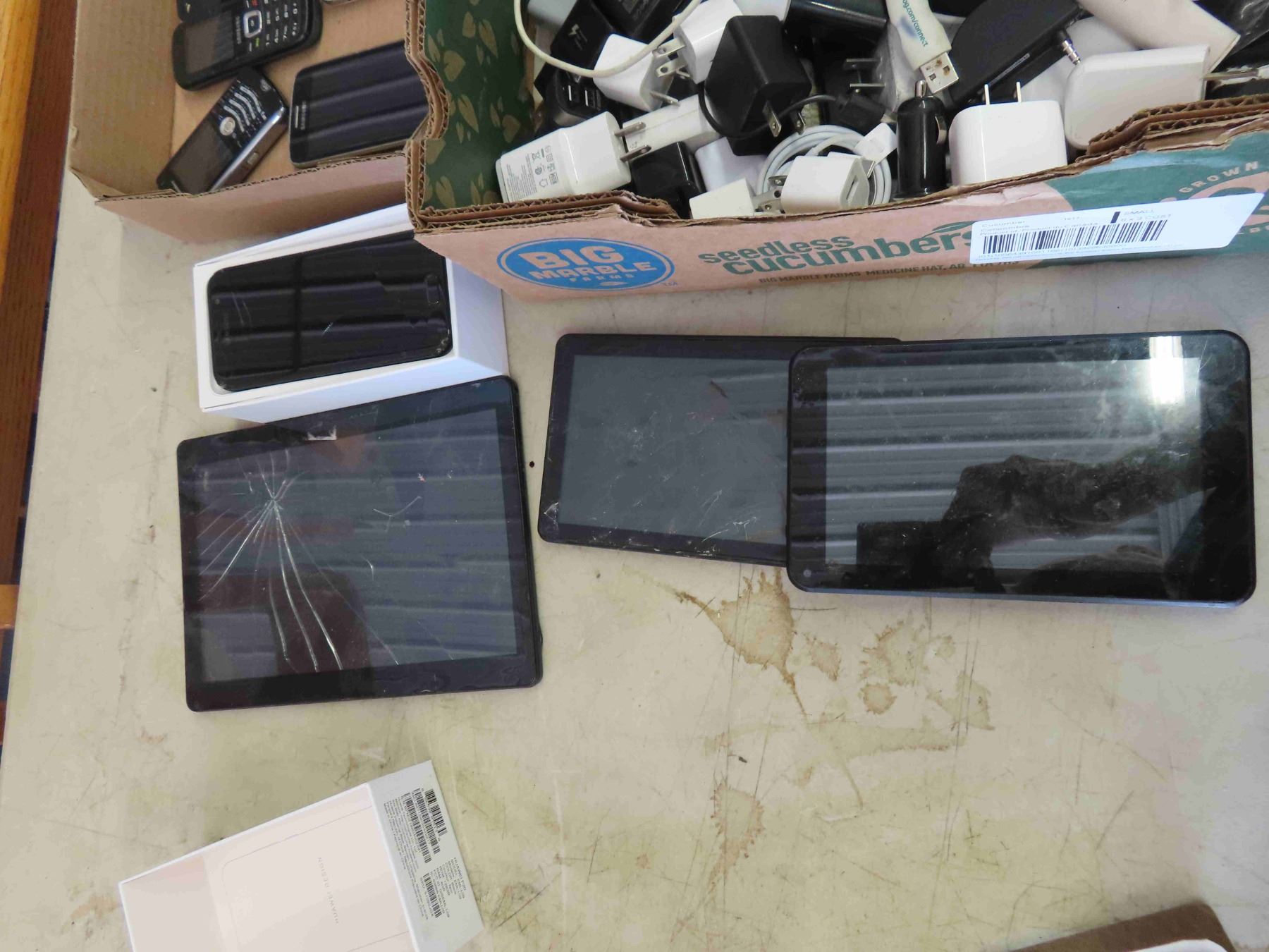 Assorted Cell Phones, Tablets + Plugs + Cords - Most Phones Appear Damaged