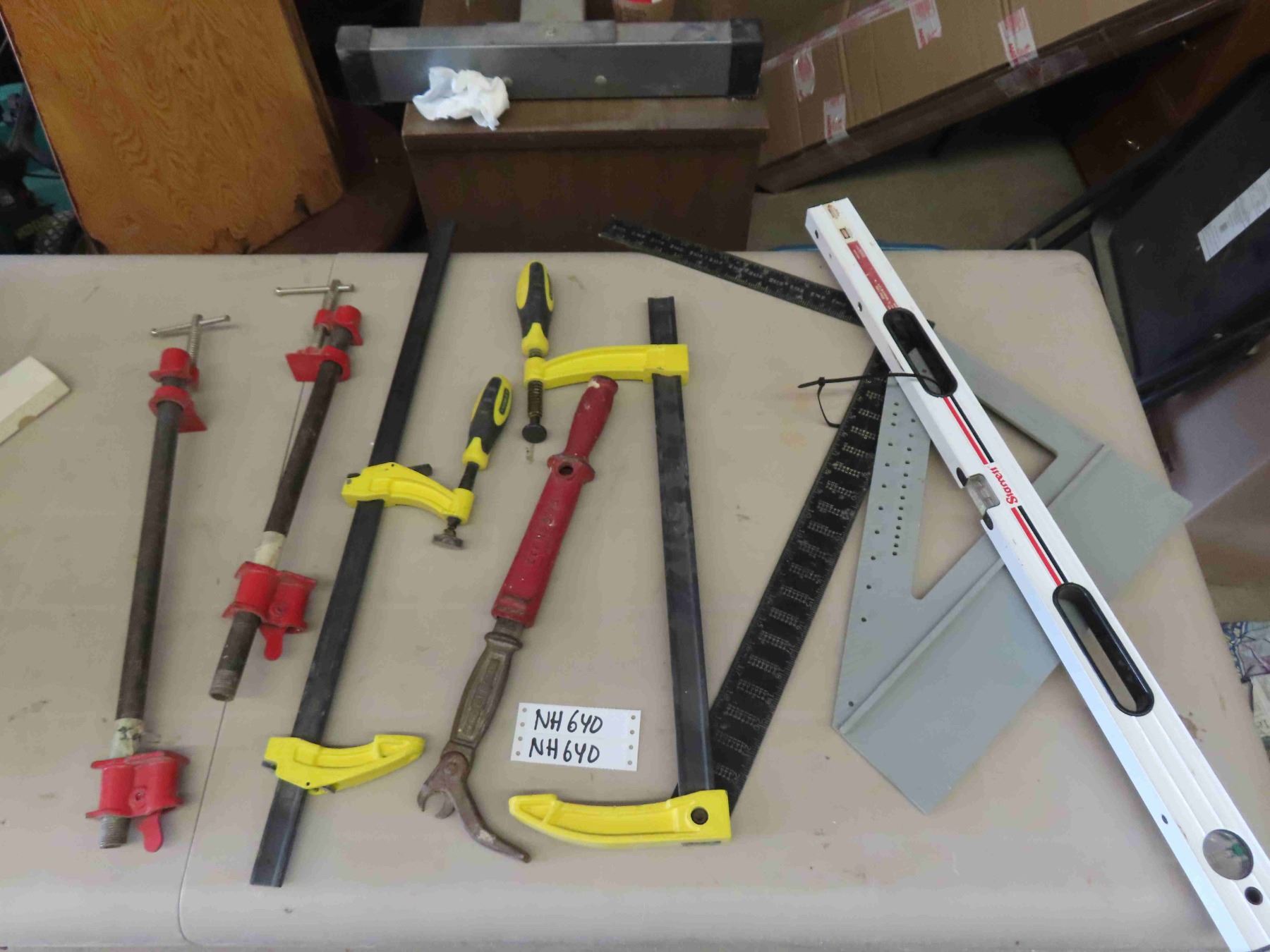 Assorted Clamps, Nail Puller, Starrett Level, 2 Squares