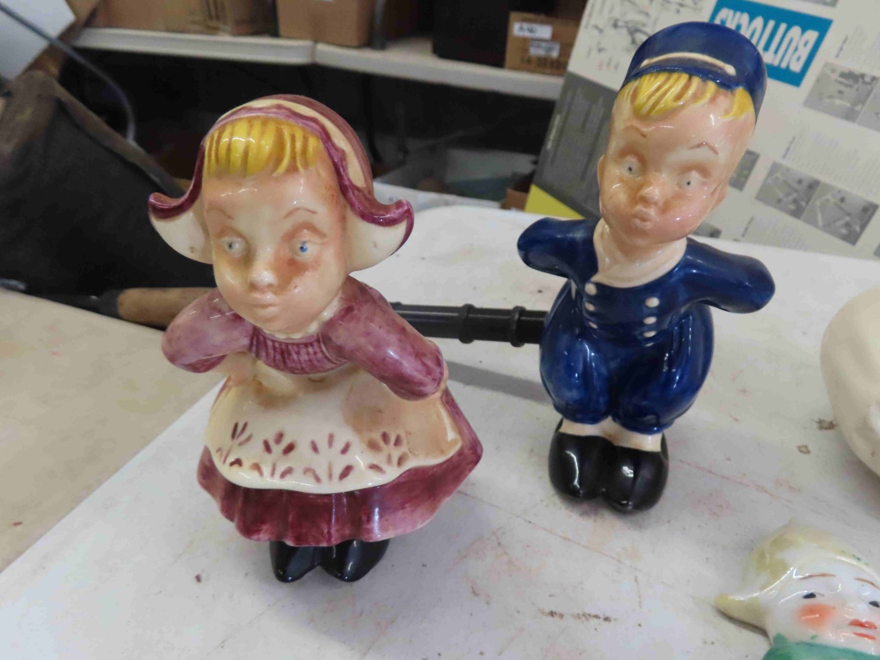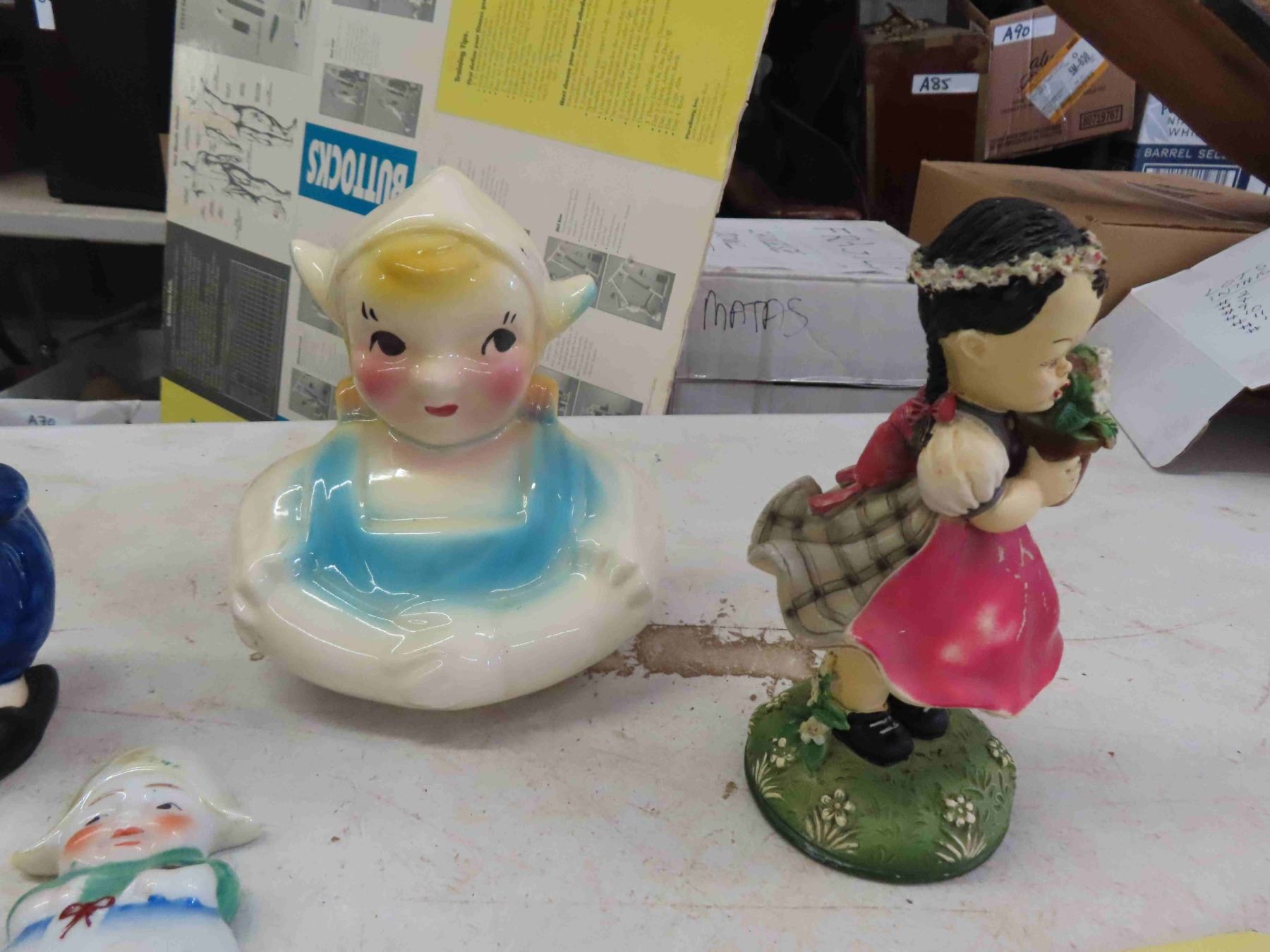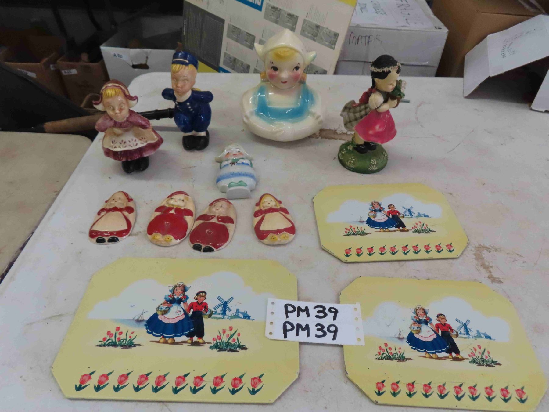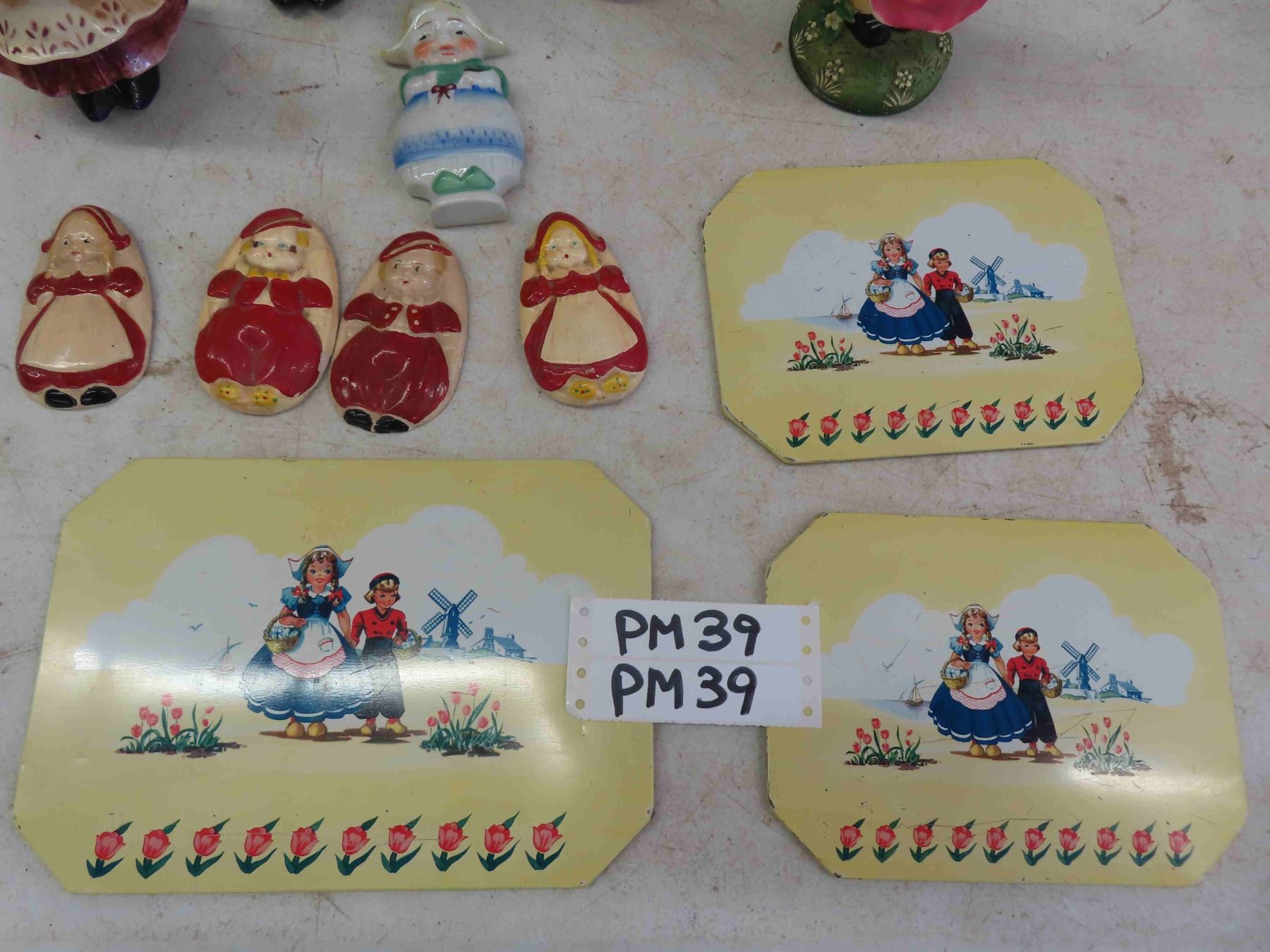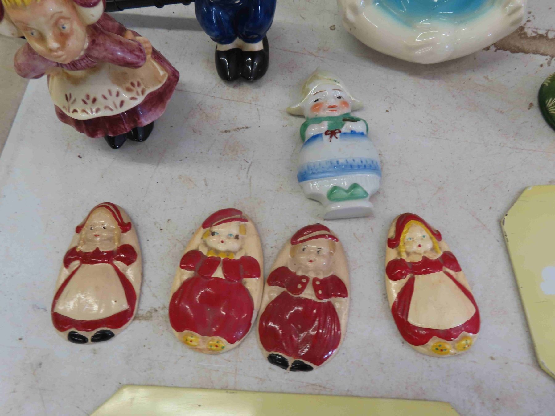 Assorted Dutch Themed Porcelain Figures, Chalkware Wall Hangers, Tin Table Protectors