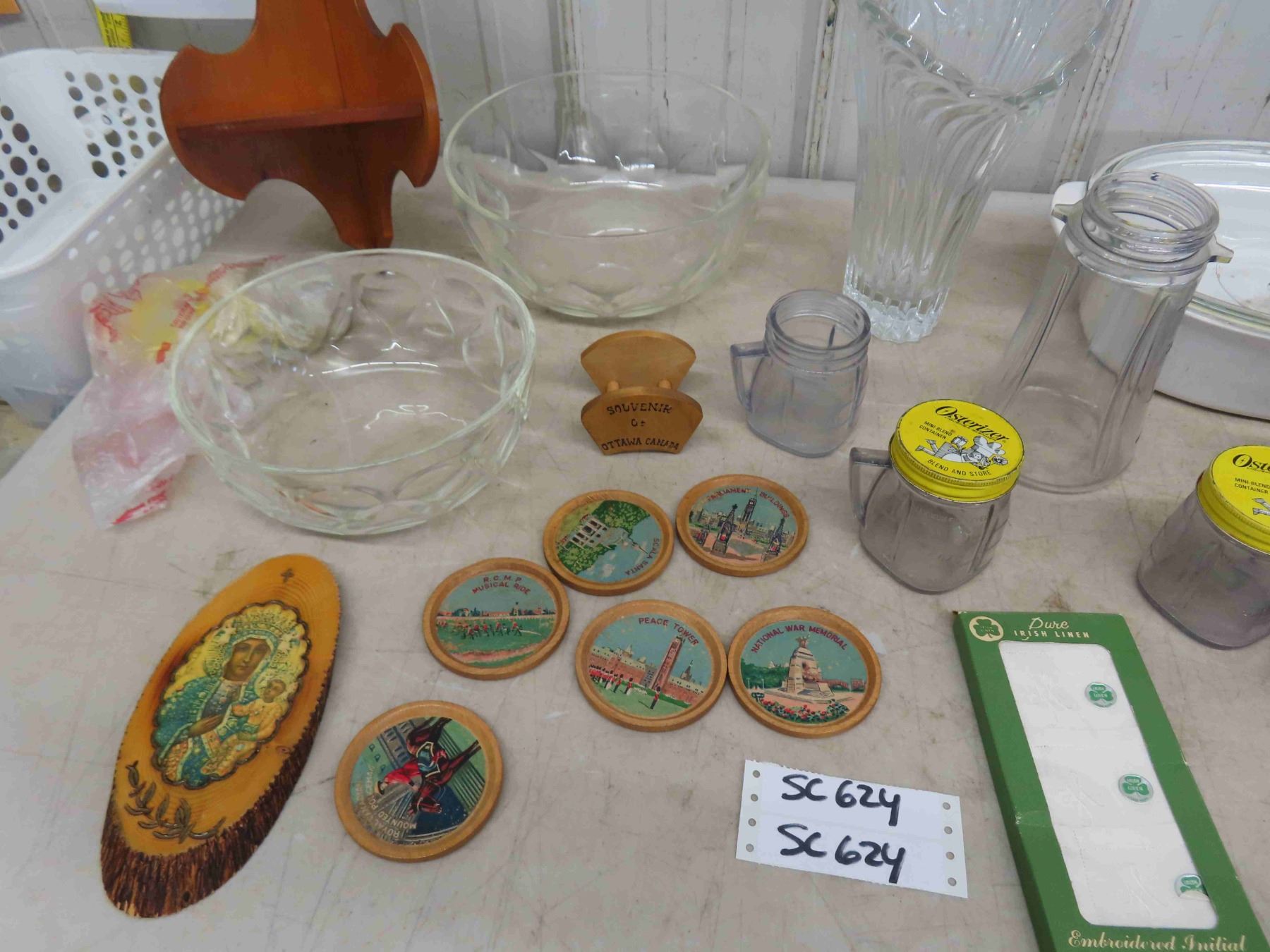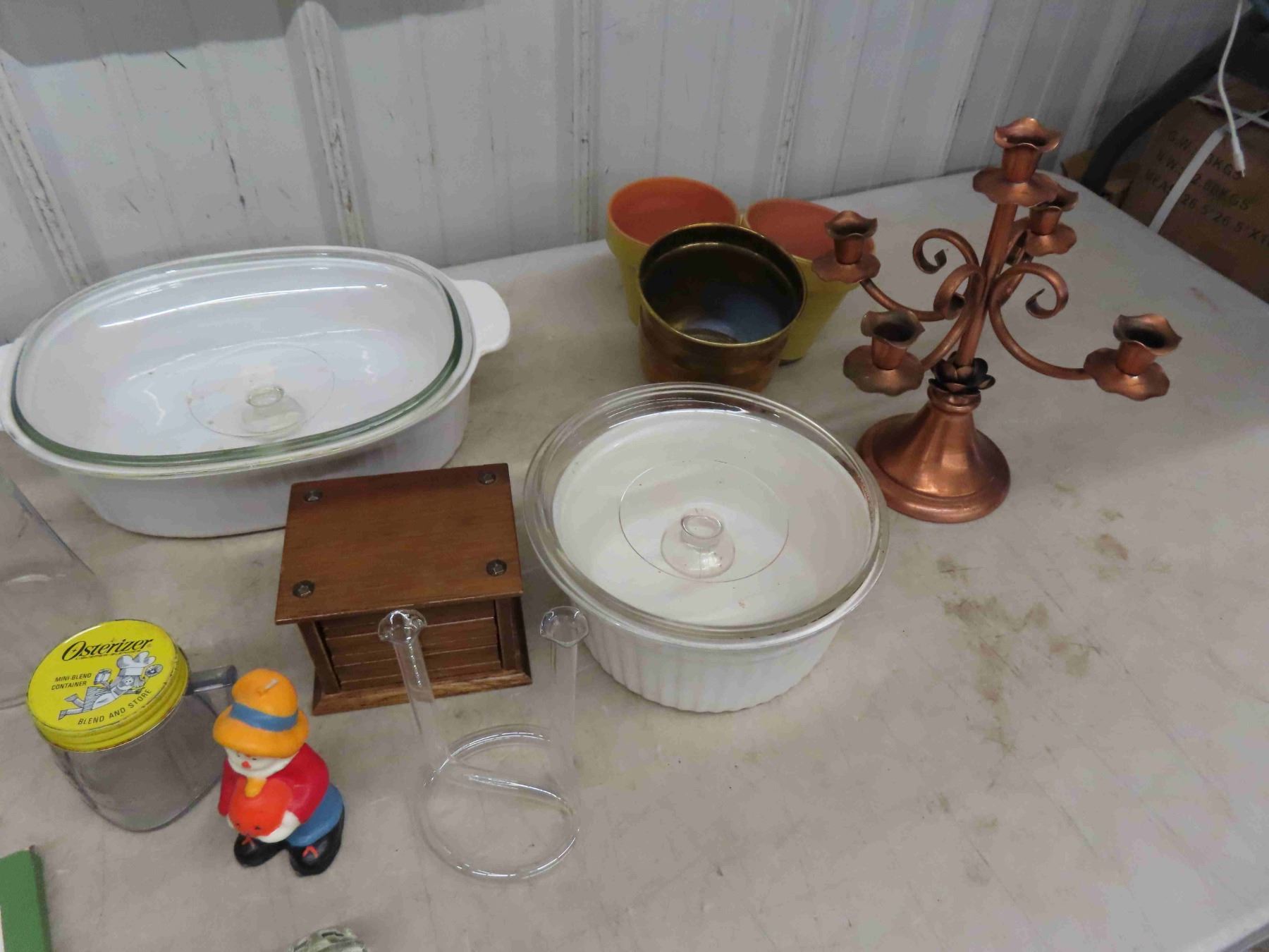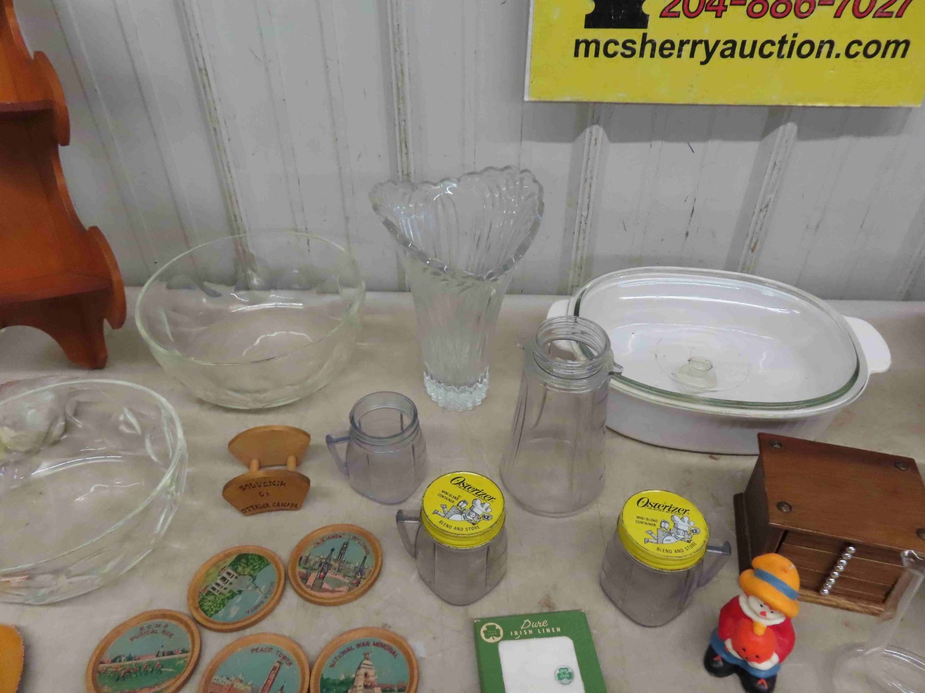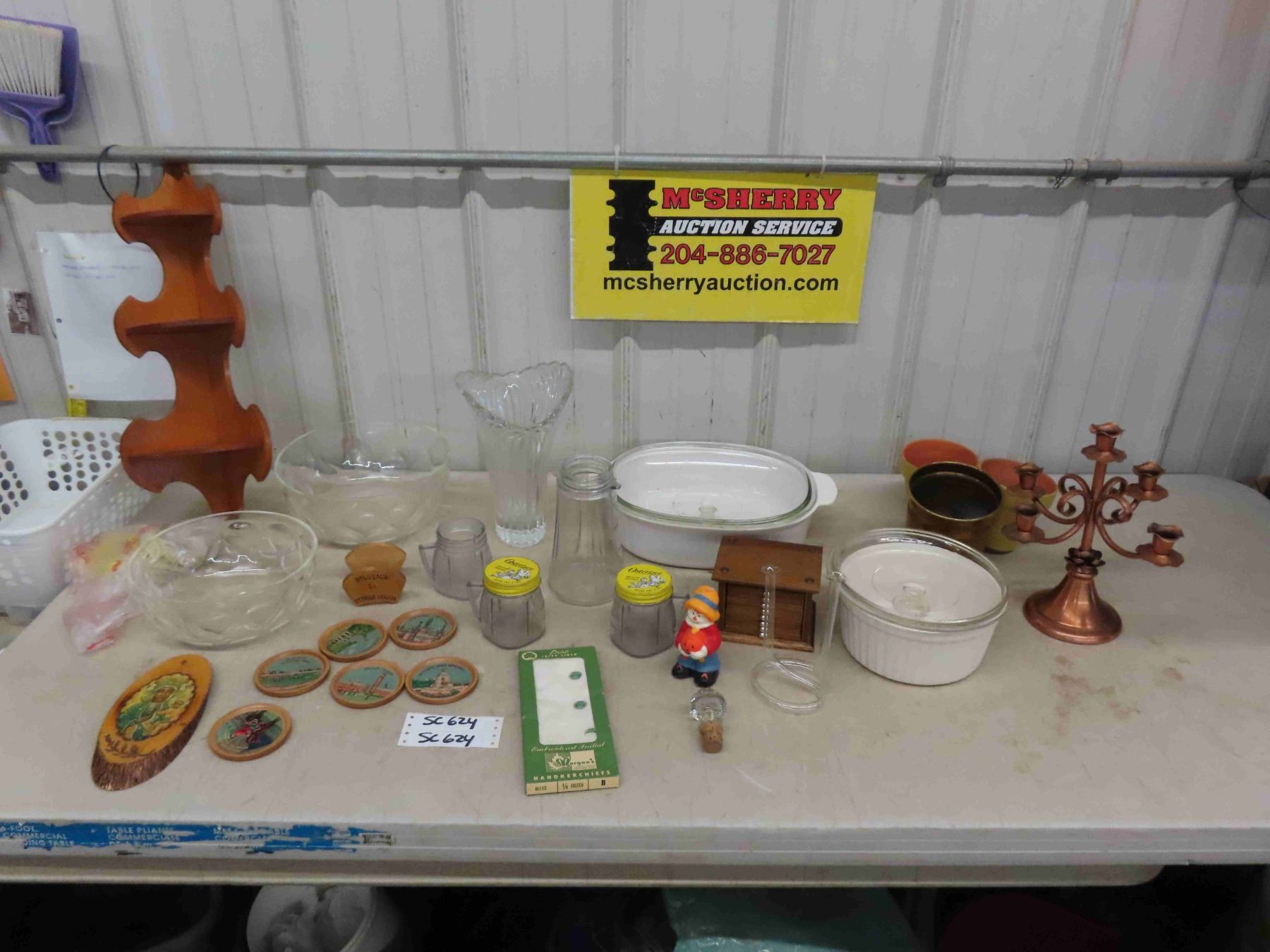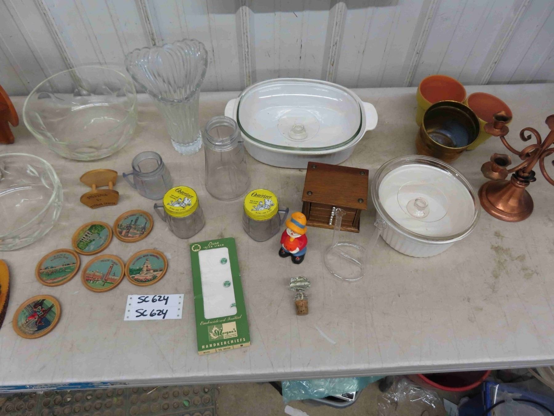 Assorted Gems ; Punch Bowls, Casserole Dishes, 3 Tier Corner Shelf, Coasters, Vase, Candelabra, plus more