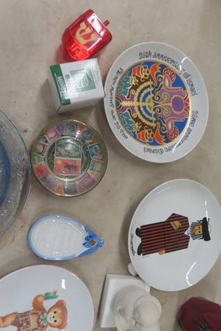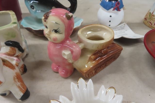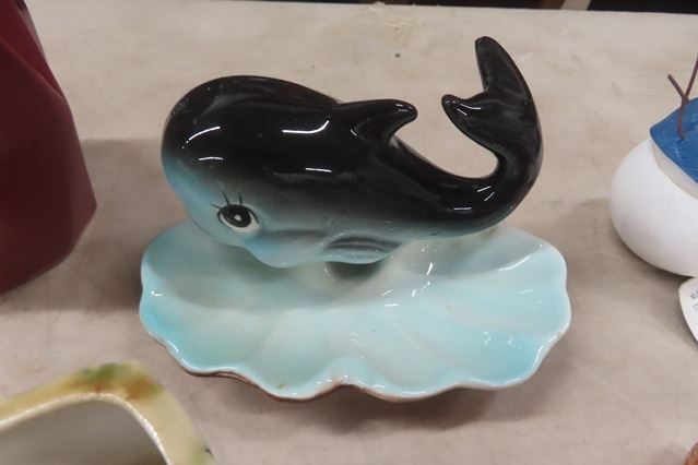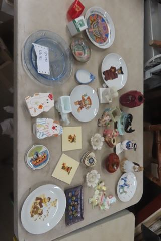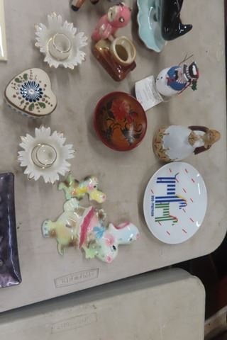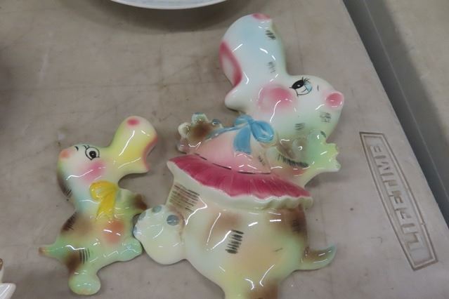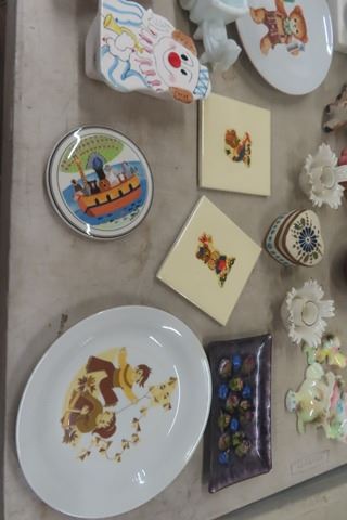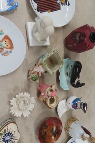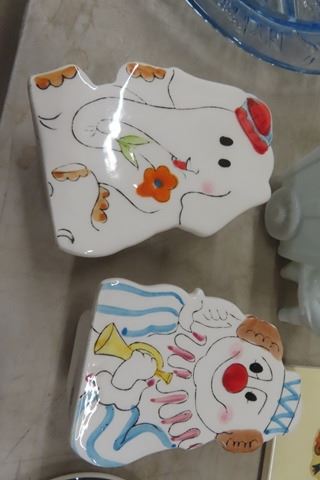 Assorted Glass Plates, Ornaments, Bowls, Trays, Relpo Wall Pocket Clown + Elephant, Tank Baby