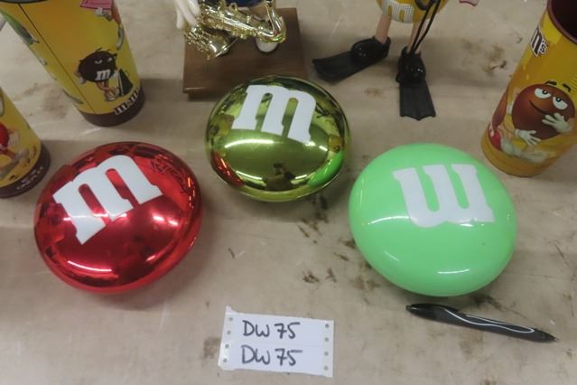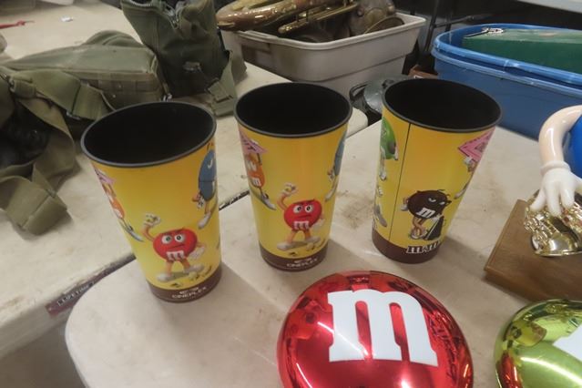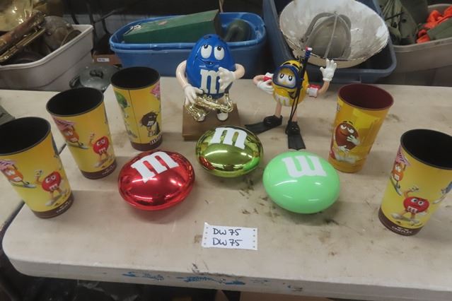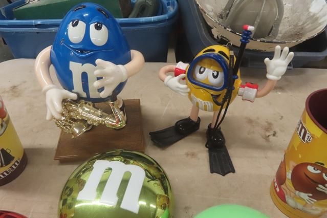 Assorted M+M Collectibles; Cups, Covered M+M Shaped Bowls, Sax Player, Snorkeler