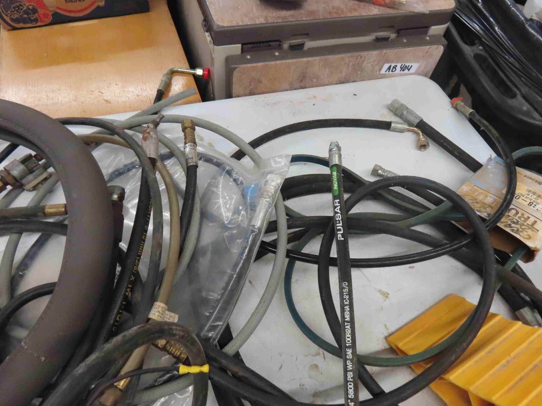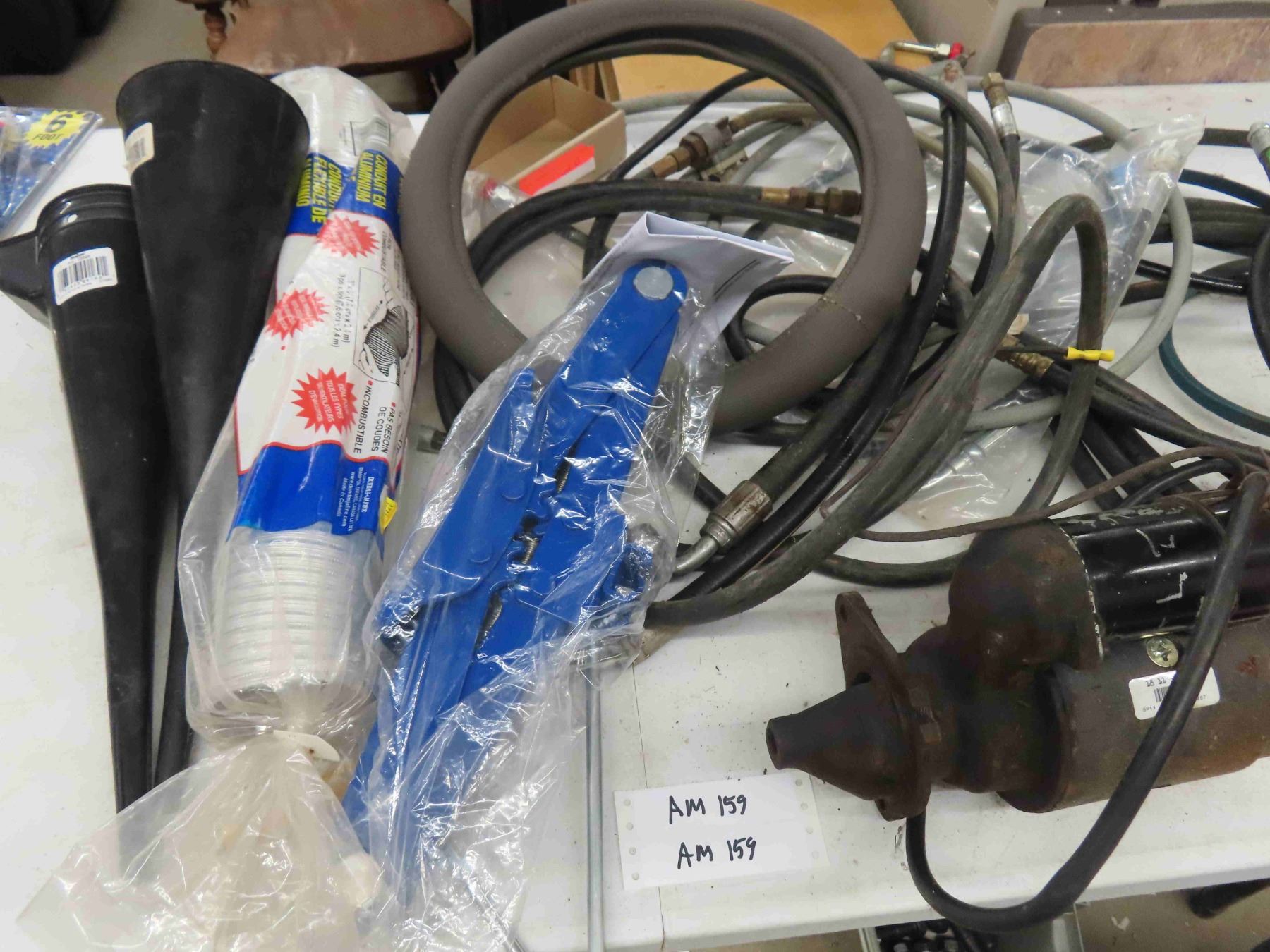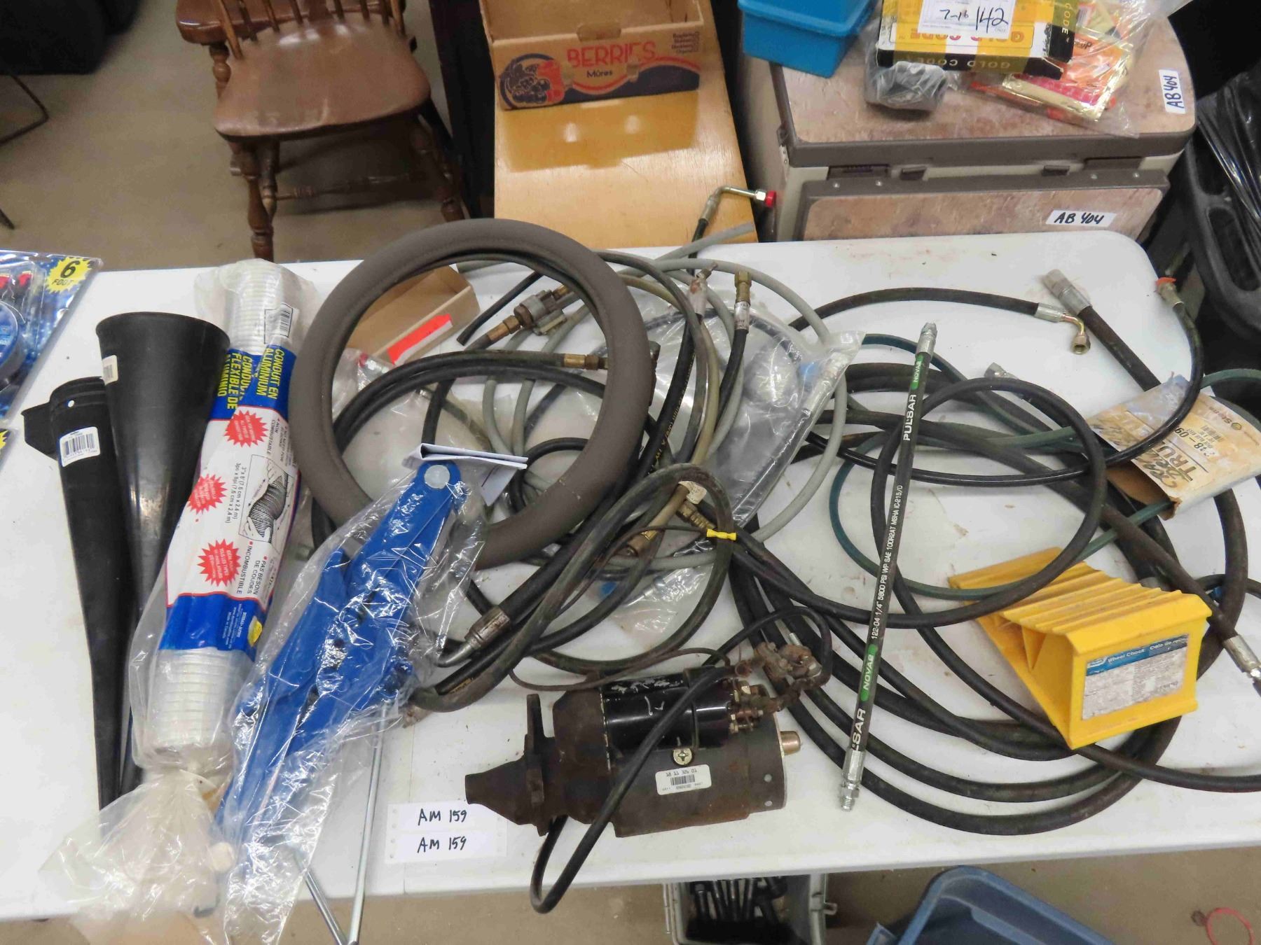 Assorted Pressure Hose, Starter, Aluminum Ducting, Funnels, Wheel Chock, Scissor Jack