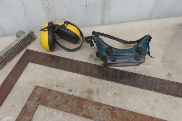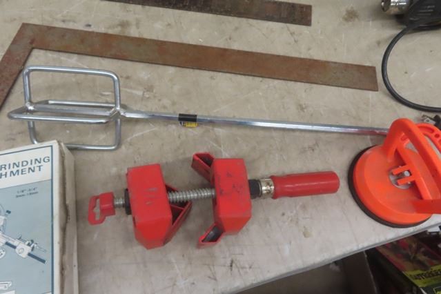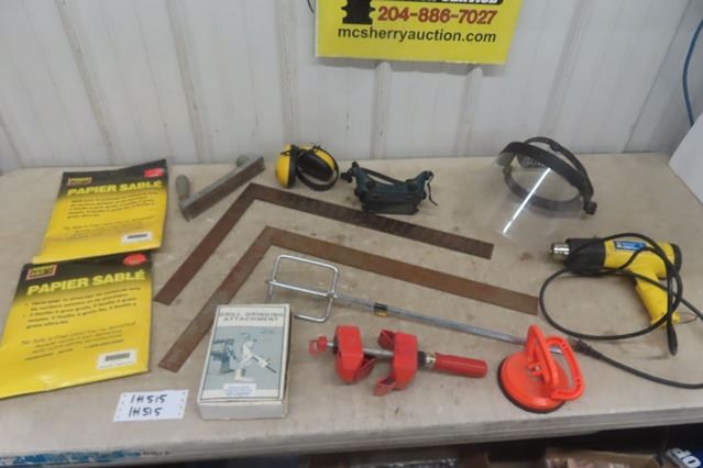 Assorted Tools; Heat Gun, Drill Bit Grinding Attachment, 2 Metal Squares, Paint Mixer, Face Shield, Welding Goggles plus more