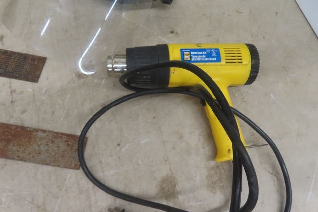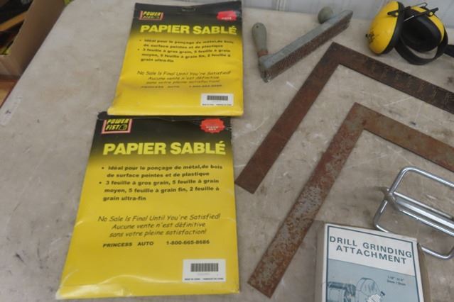 Assorted Tools; Heat Gun, Drill Bit Grinding Attachment, 2 Metal Squares, Paint Mixer, Face Shield,