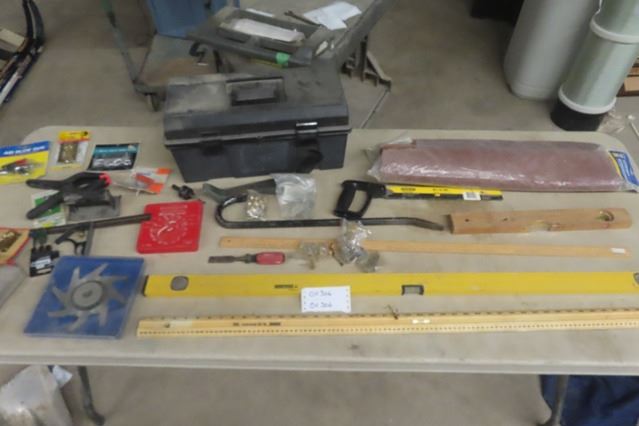 Assorted Tools; Levels, Prybar, Saw, Molding Head, Dado Blade, Packaged Hardware, Tool box, Wire Bru