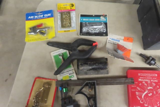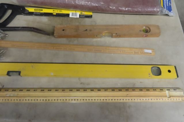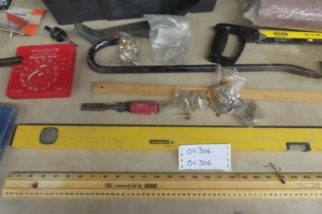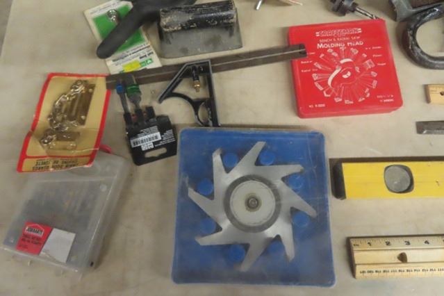 Assorted Tools; Levels, Prybar, Saw, Molding Head, Dado Blade, Packaged Hardware, Tool box, Wire Brushes plus more