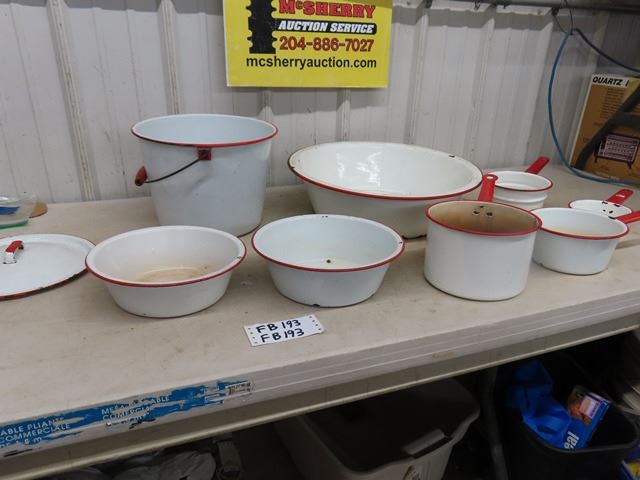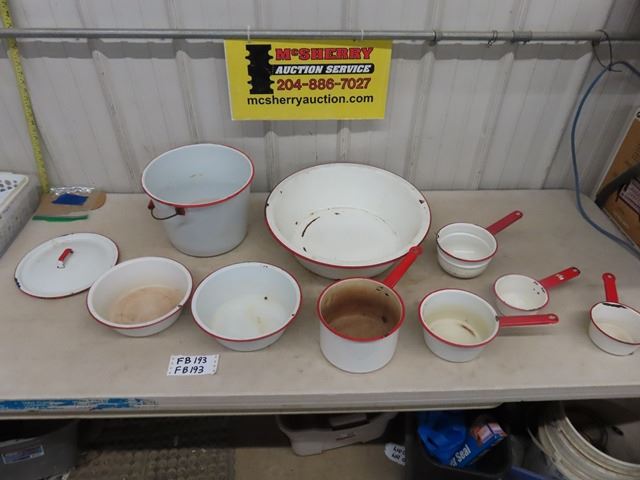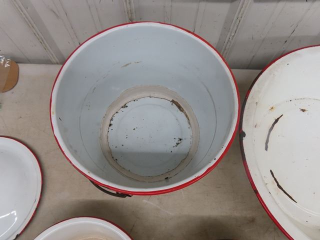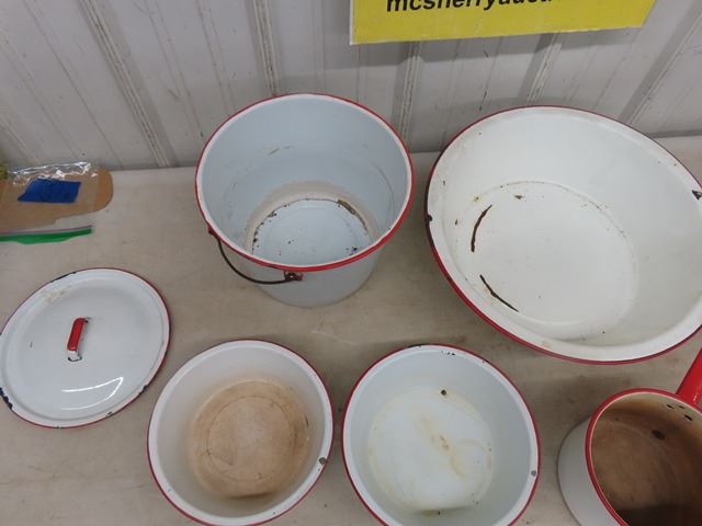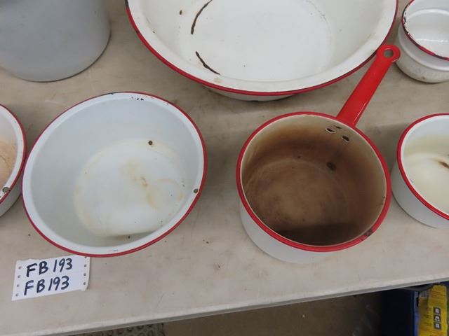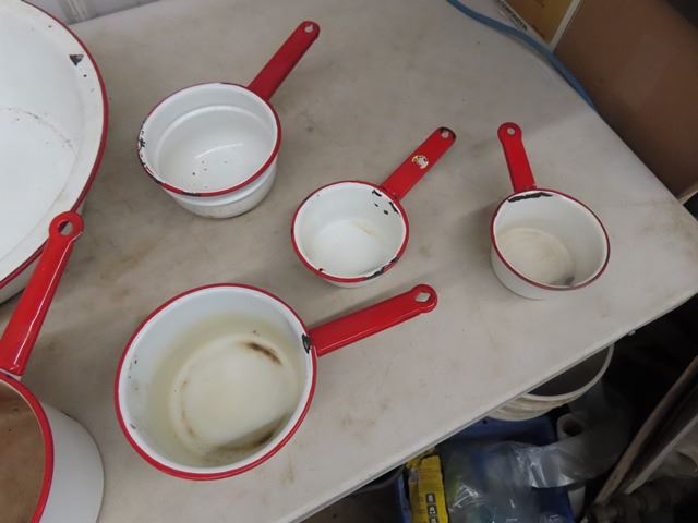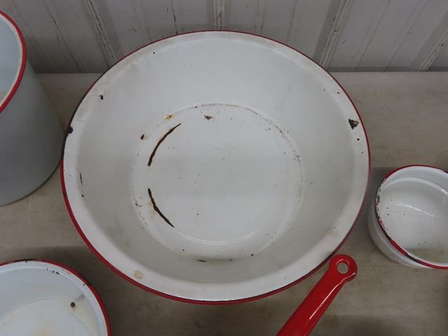 Assorted White Enamel Pots + Bowls with Red Trim - 10 Pcs Total