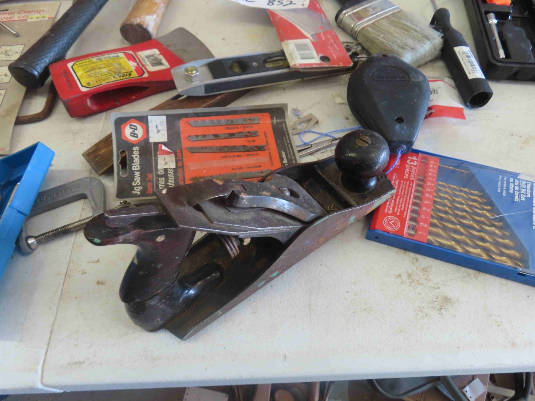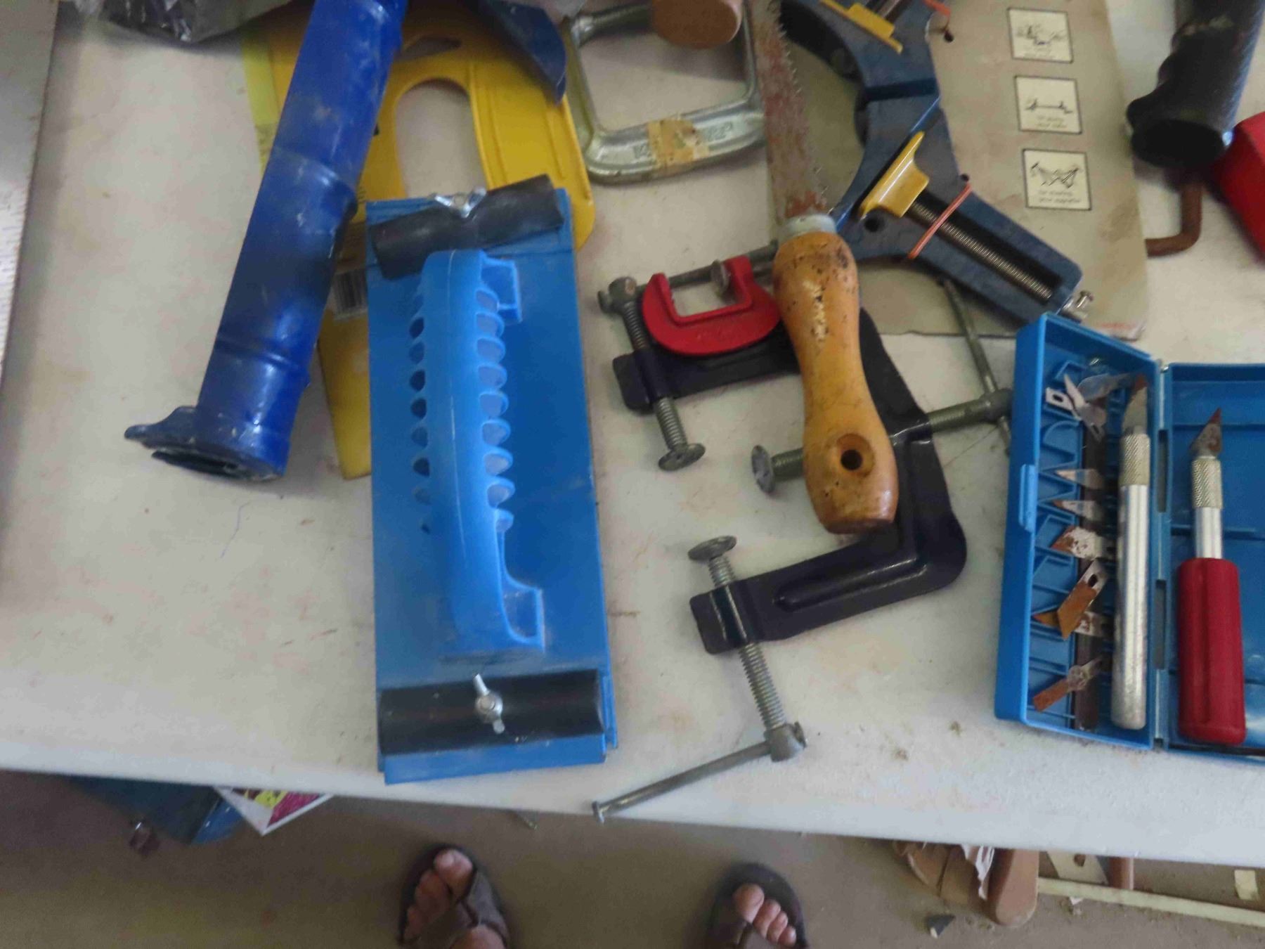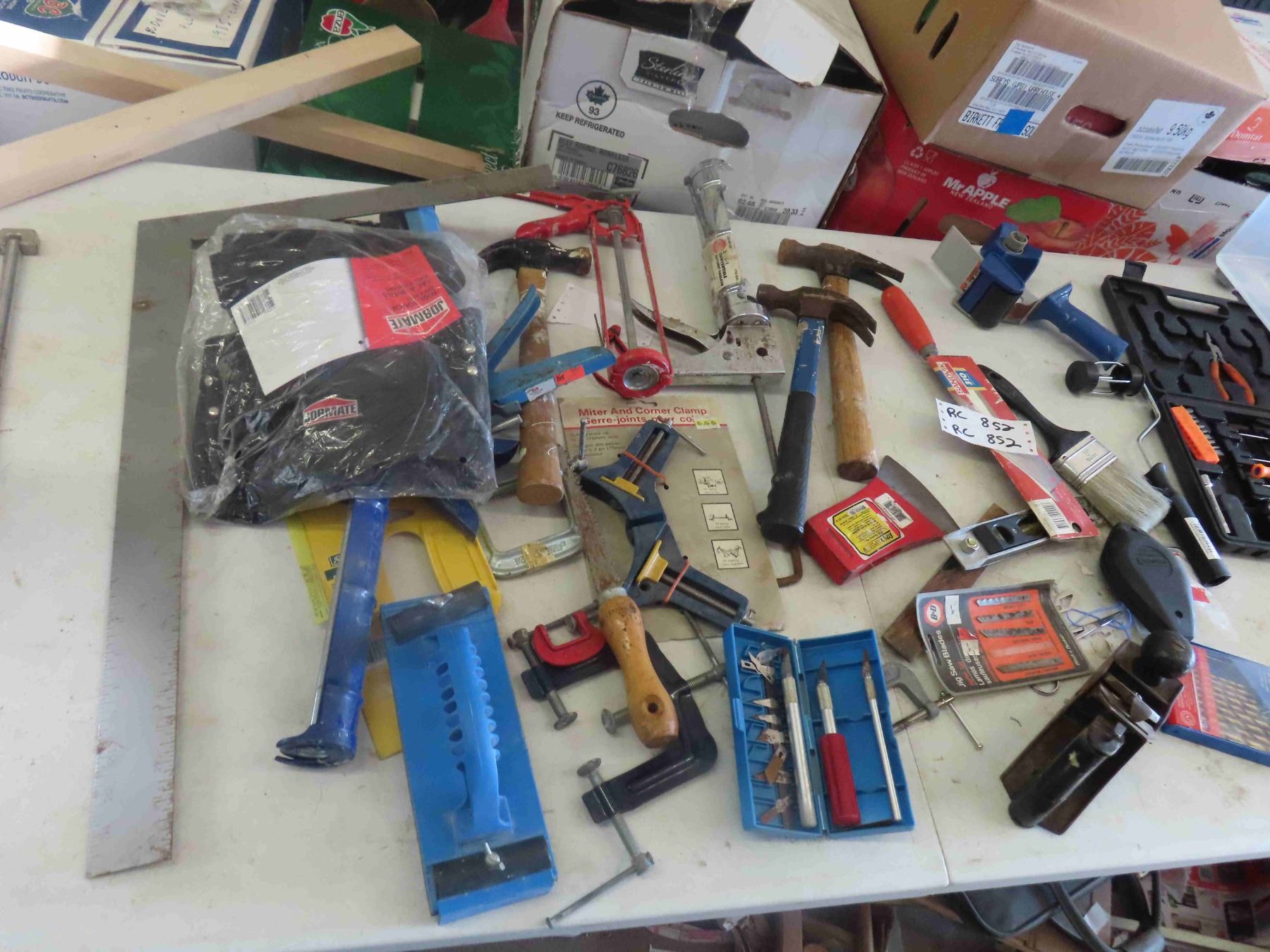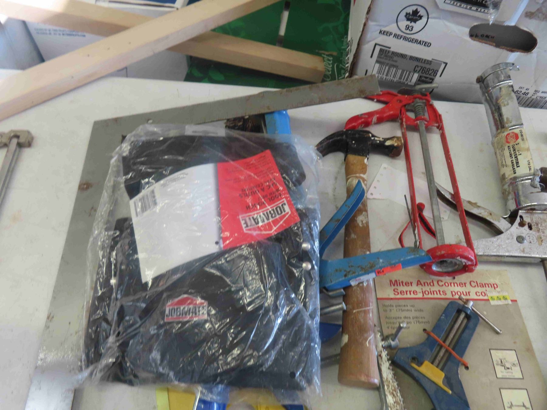 Assortment of Carpentry Tools : Caulking Gun, Clamps, Pliers, Hammer, Drill Bits, Square, New Tool Pouch, Plus