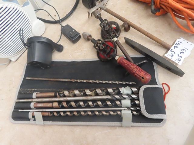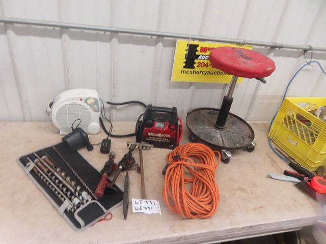 Auger Bits, Electrical Heater, Extension Cords, Booster Pack with NO Power Cord, Shop Stool with Tears