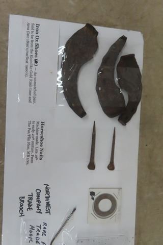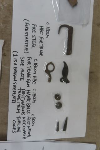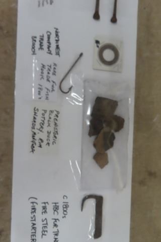 Authentic 1800 Hudson's Bay Company Fur Trade Artifacts Including; Fire Steel, Trade Gun Serpent, Sideplate, Hawk Bell, Tinkling Cones, - used to Trade with Indigenous & Also Incuding Prehistoric Black Duck Pottery Northwest Co. Brooch, Oxen Shoes from Klondike Gold Rush, Rare Fish Hook & Research Papers