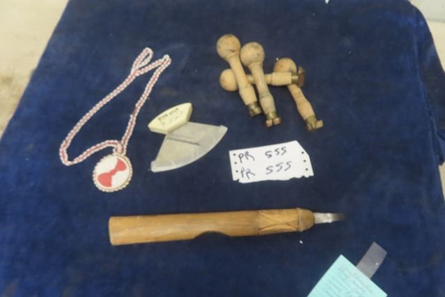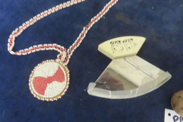 Authentic Hand Made Totem Pole, Carving Tool, Hide Scrape Knife, 4 Handled Stamps, Beaded Indigenous Necklace