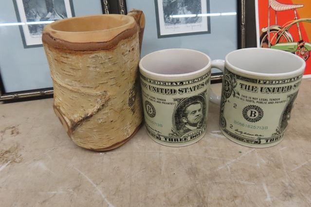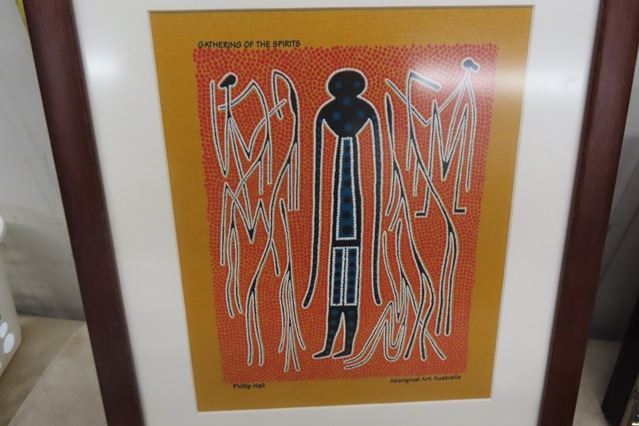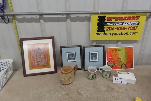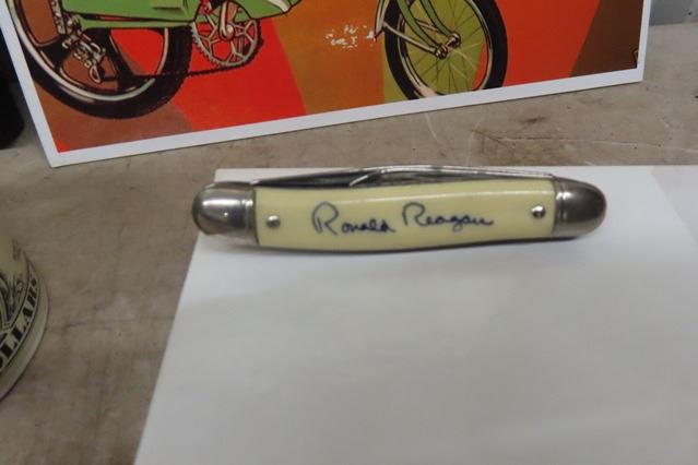 Autographed George Barris Certificate, Pocket Knife with Ronald Reagan Name On IT, Indigenous Framed Art + 2 Prints, plus more