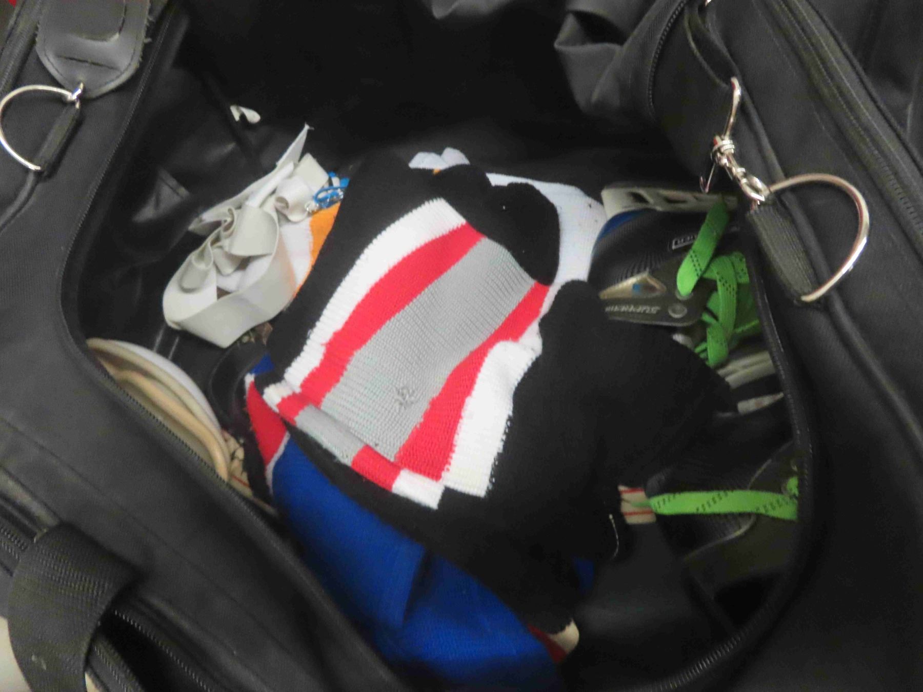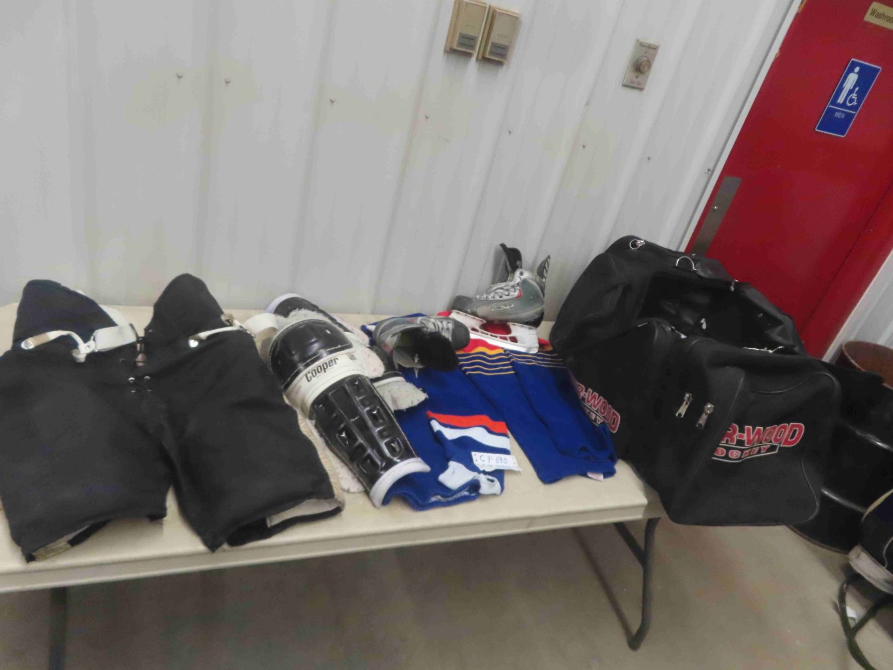Bag of Hockey Equipment ; Skates, Knee Pads, Socks, Pants, plus more