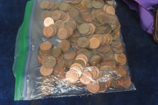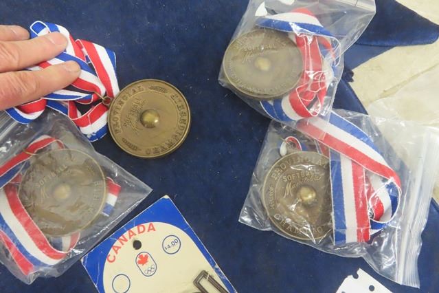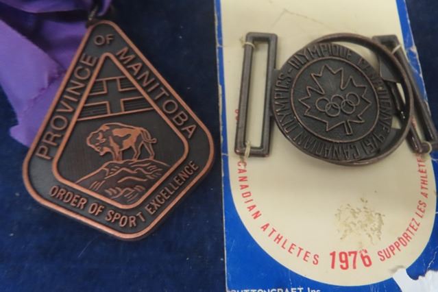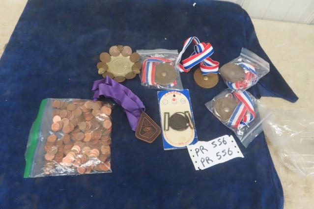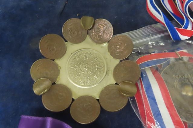 Bag of Pennies , Olympic 1976 Belt Buckle, Sports Award Medals, Ashtray Made of Coins