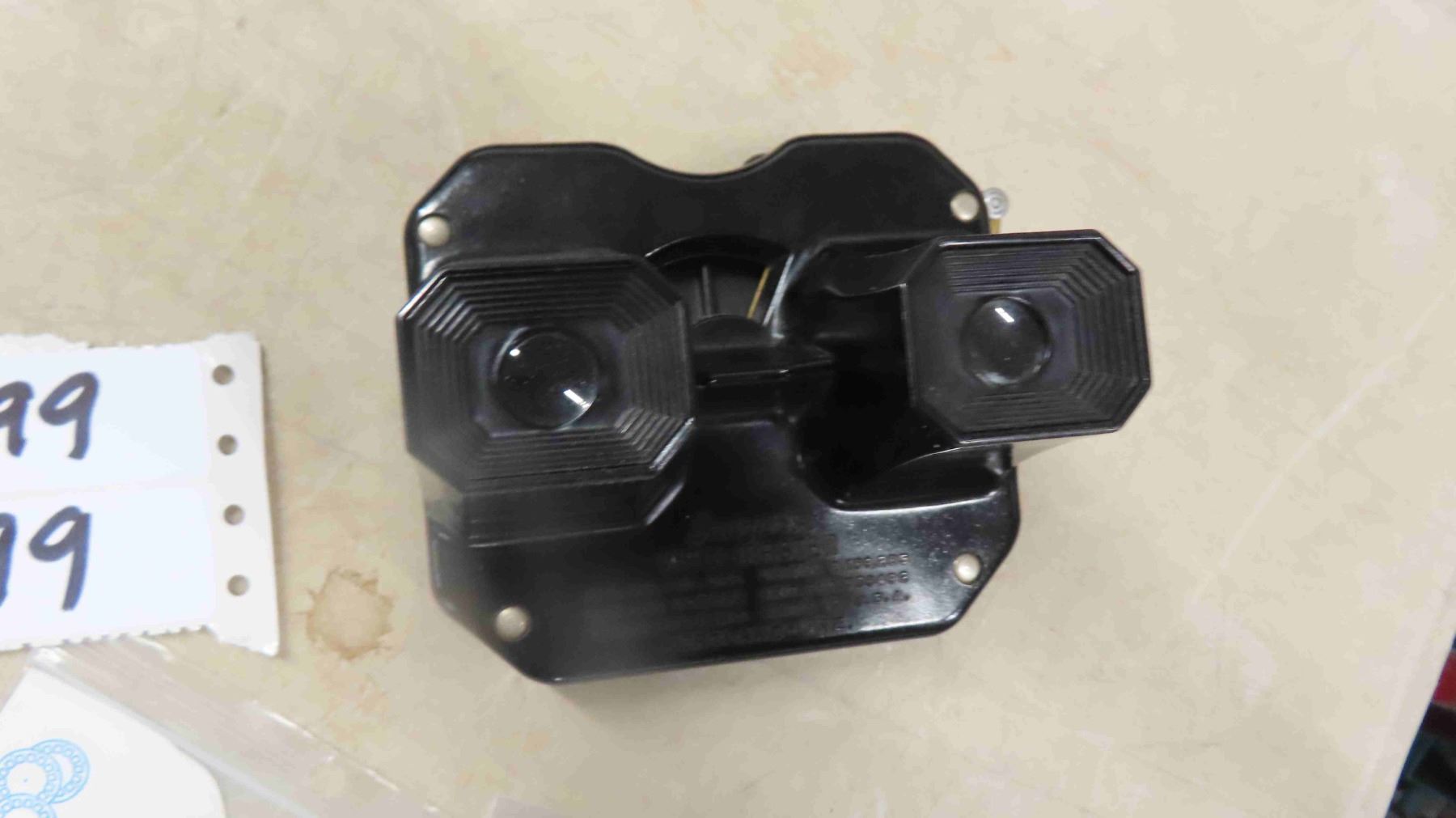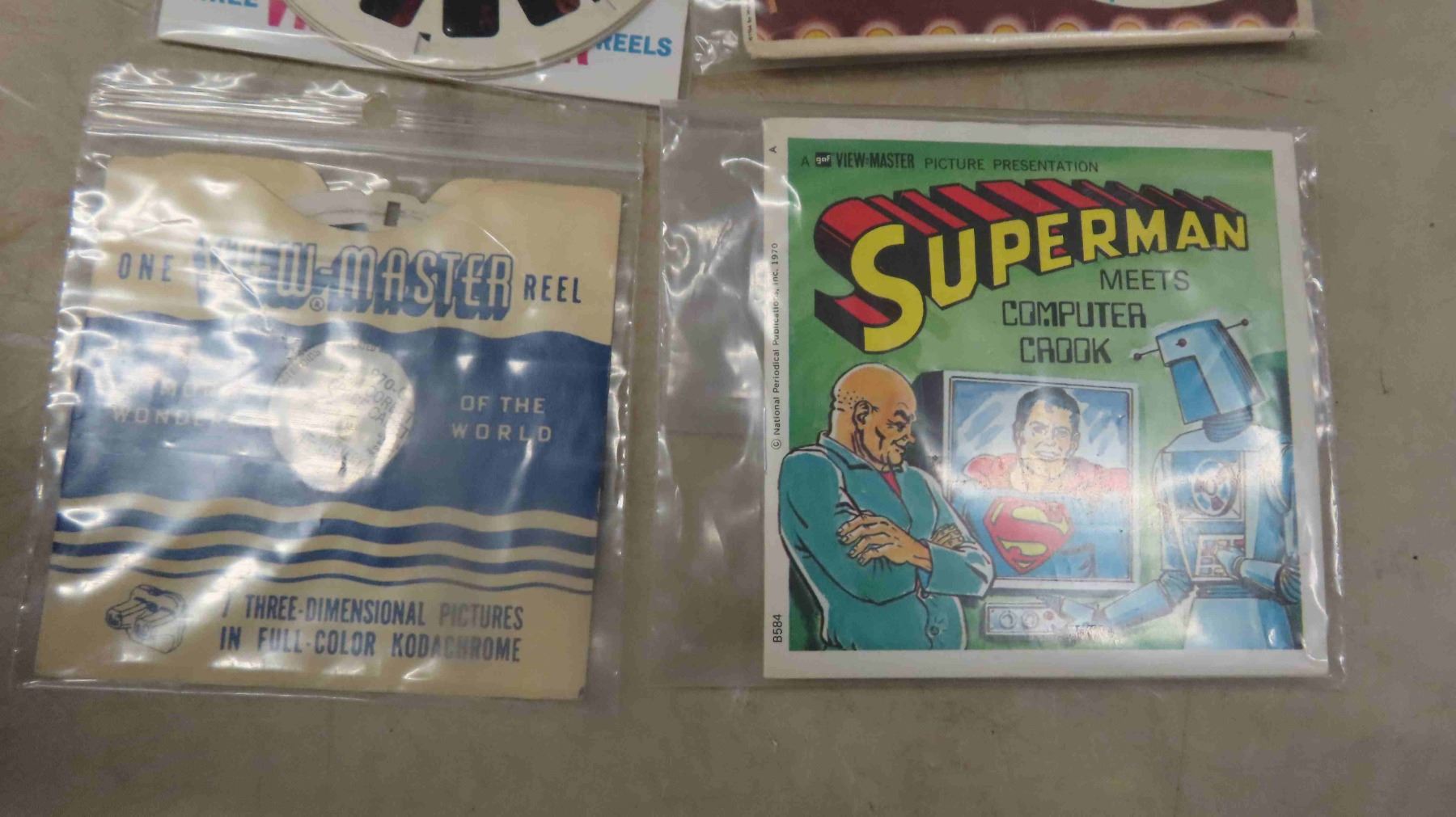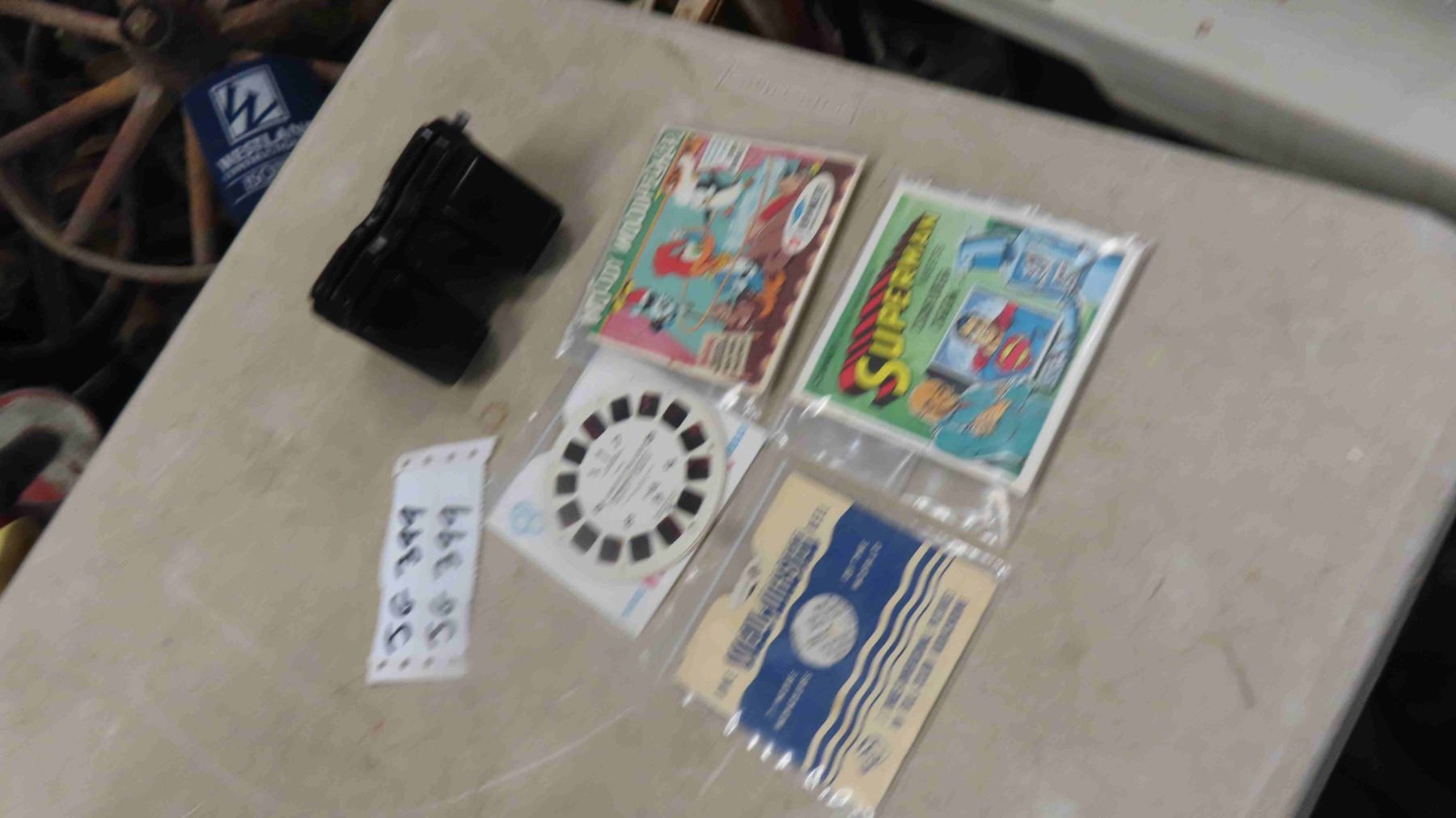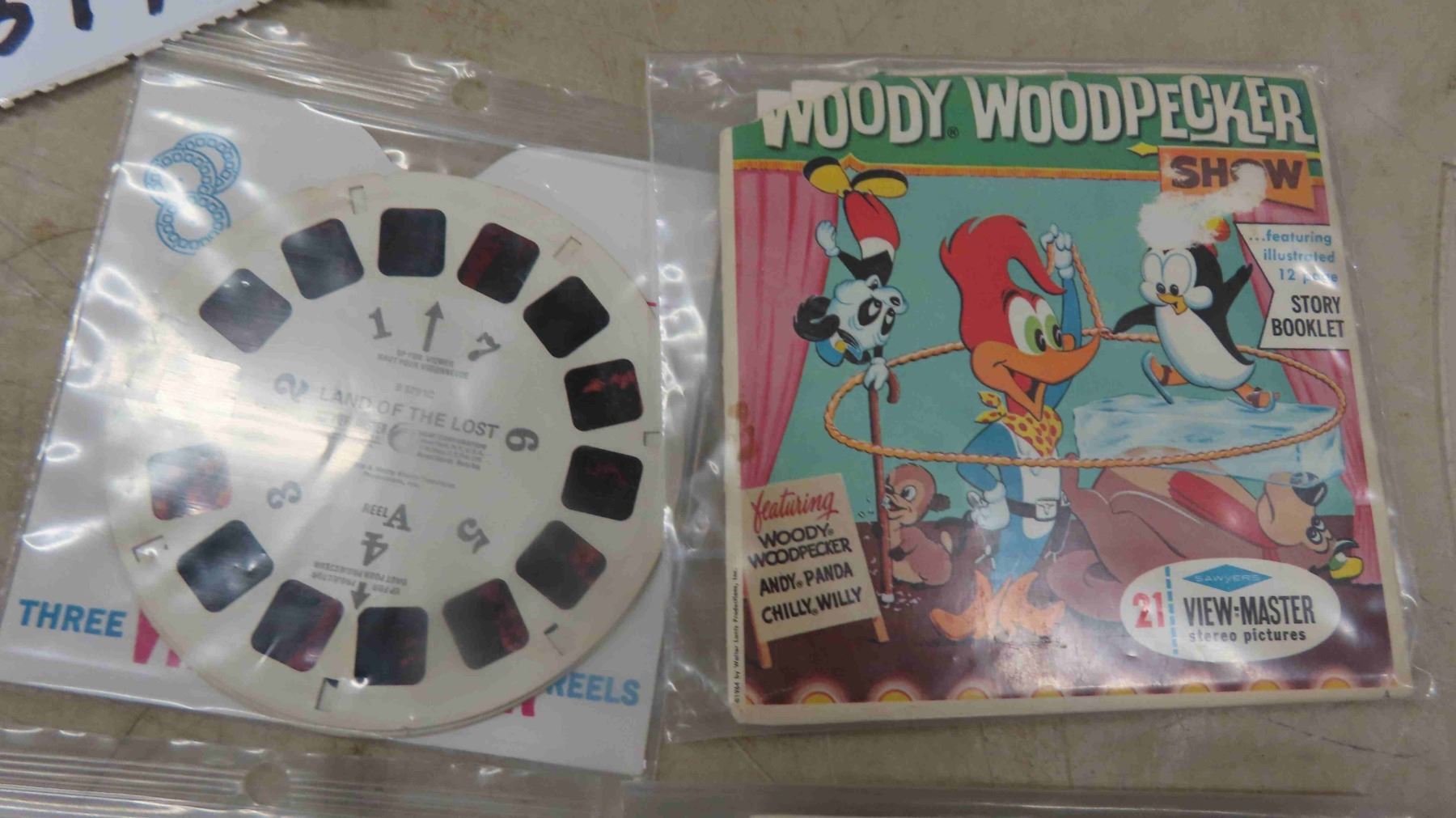 Bakelite Sawyer's View Master Viewer with 4 Viewmaster Reels ; Superman Meets Computer Crook, Tom Corbet Space Cadet, Woody Woodpecker, Land of The Lost