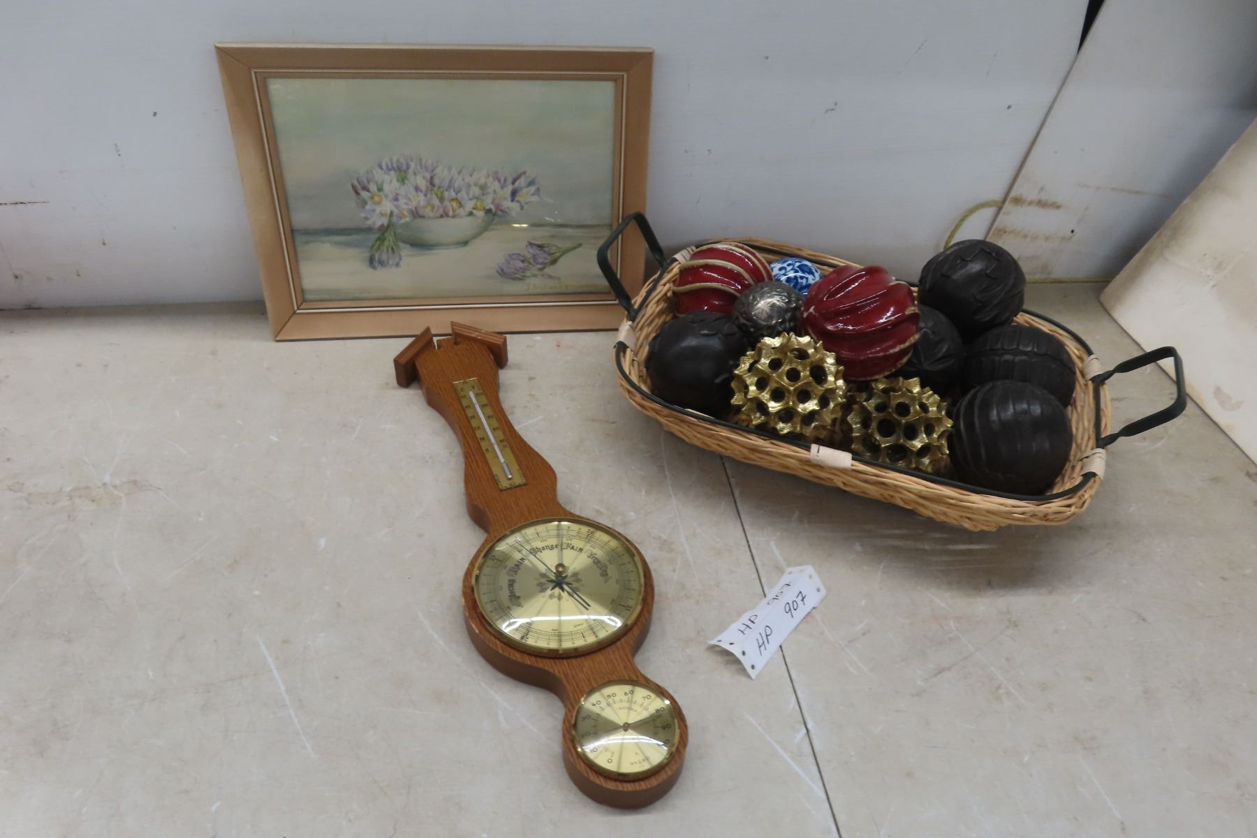 Barometer, Framed Picture 12x15, and Basket Full of Decorative Balls