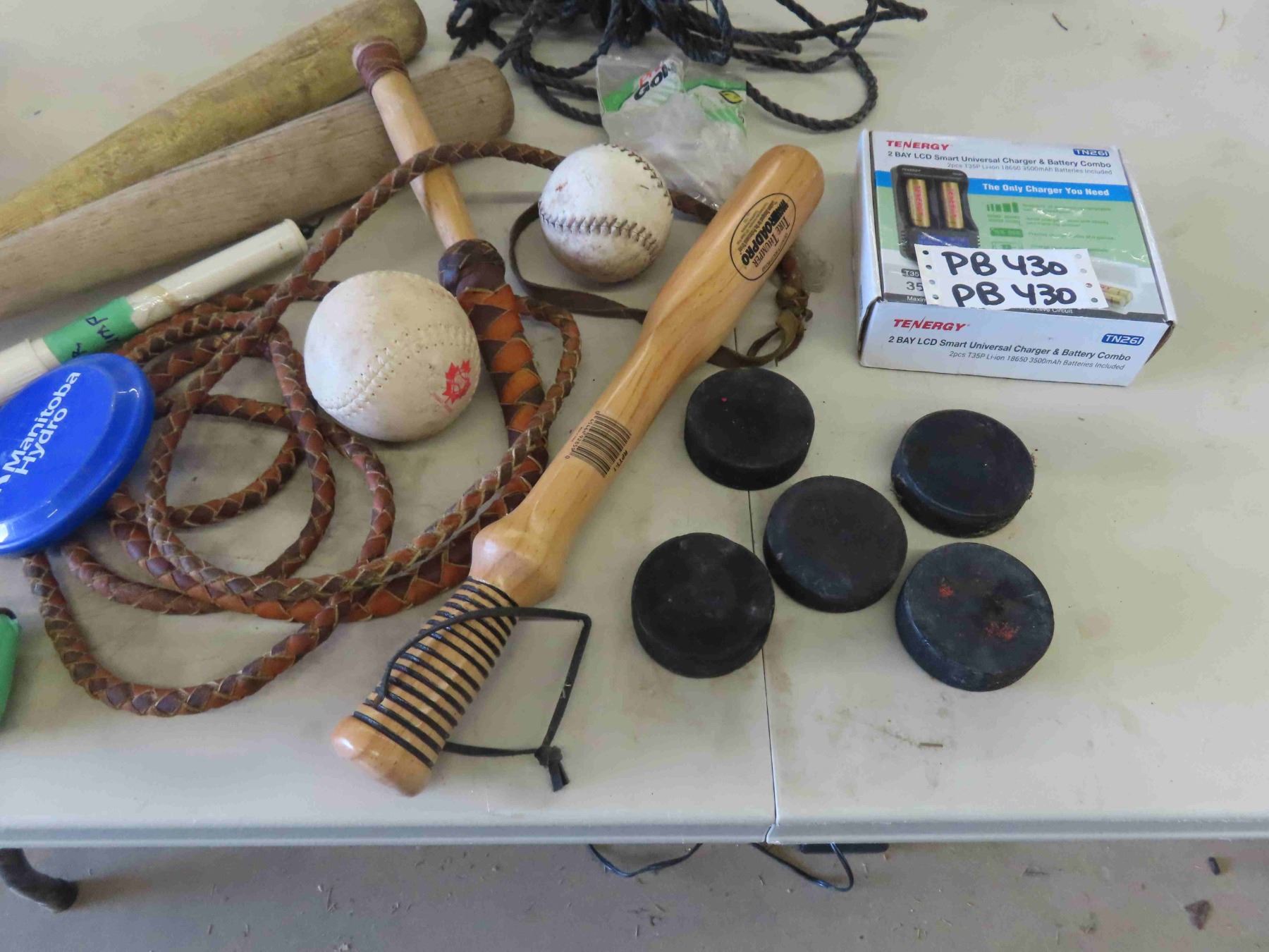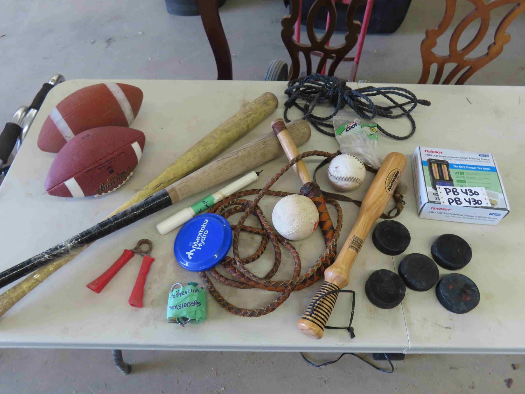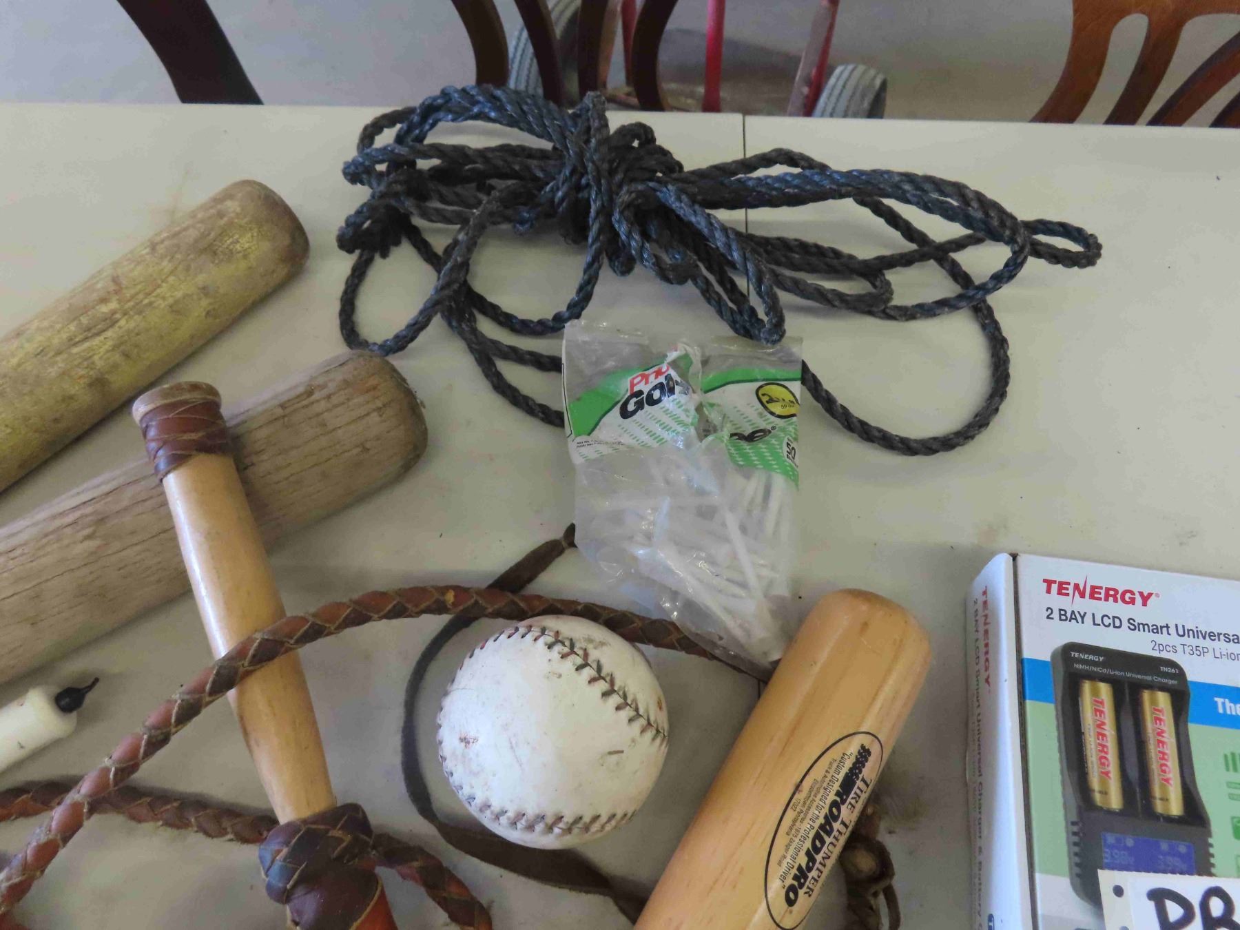 Baseball Bats, Hockey Pucks, Footballs, Battery Charger