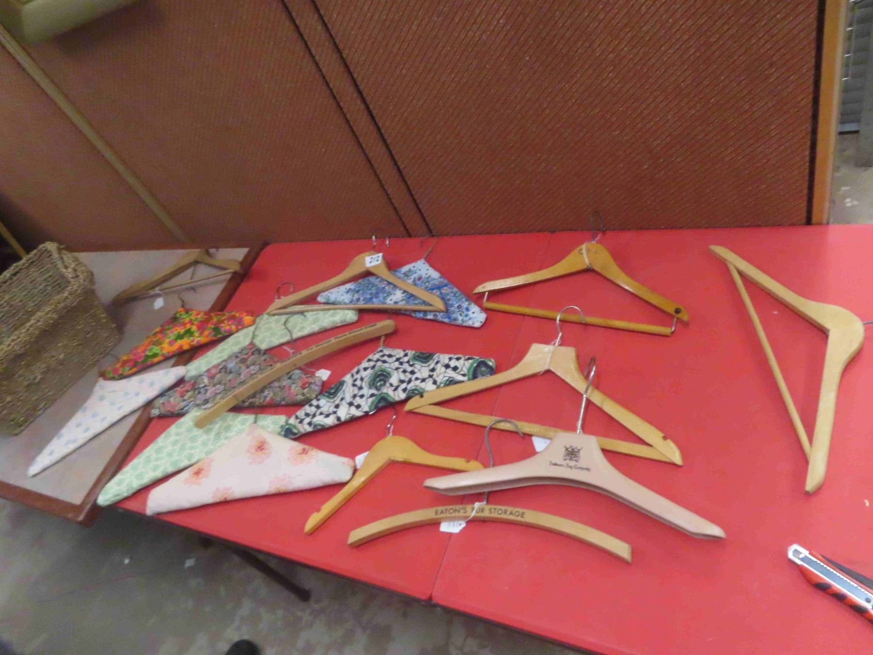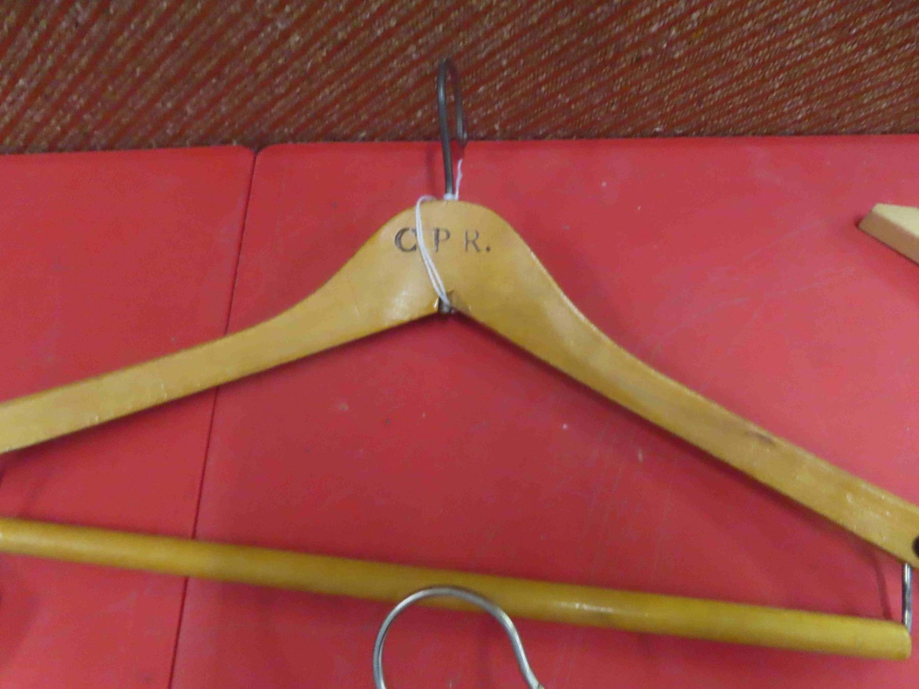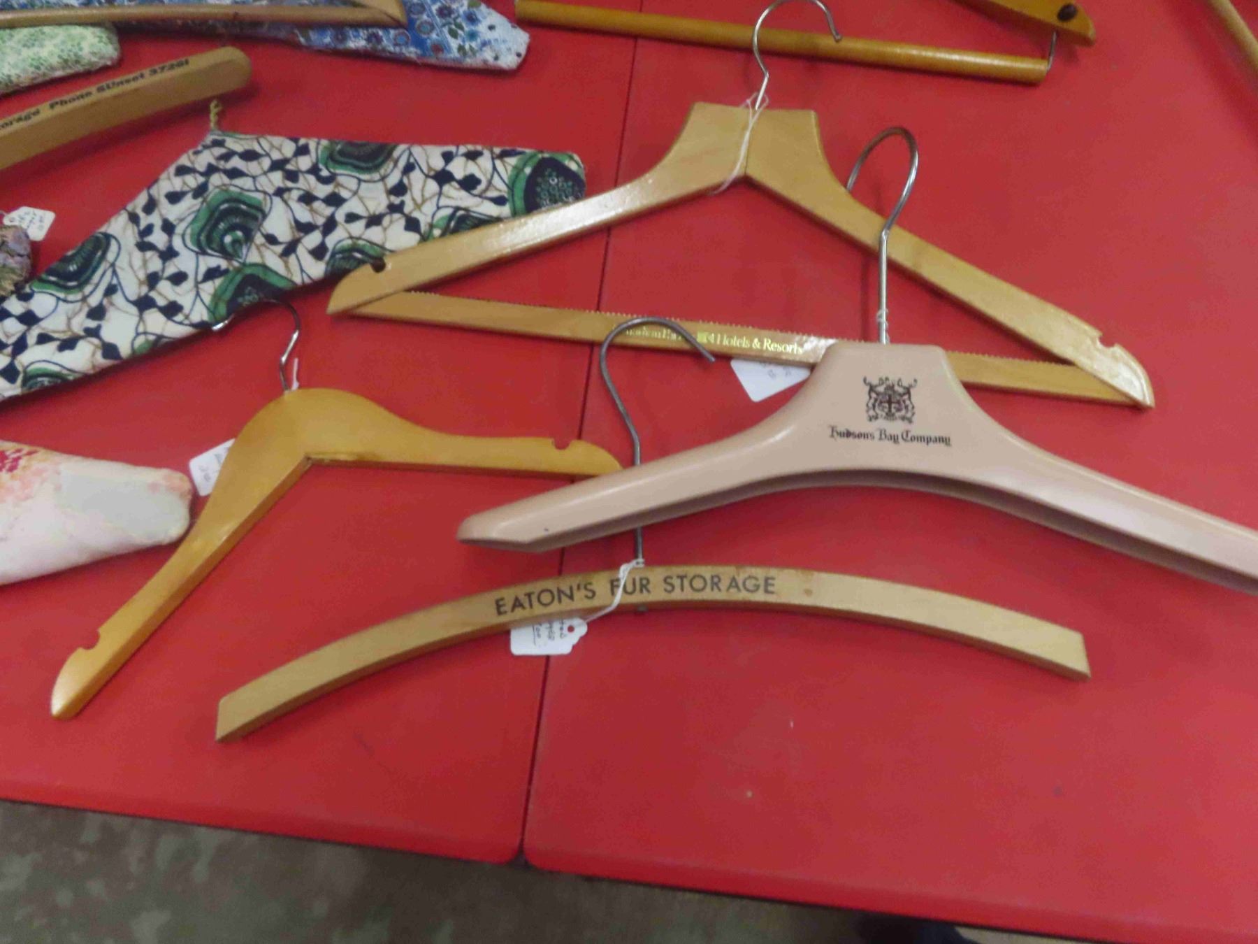 Basket Full of Wood Hangers Some with Advertising : Hudsons Bay, CPR, Perths, Eatons