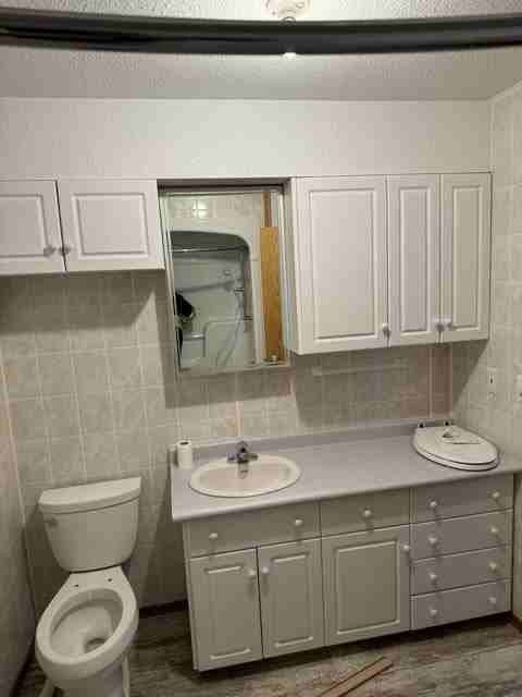 Bathroom Counter - Counter Top Measures 61'' x 23'' EVERYTHING IN PHOTO (Top Cupboards, Counter Top, Bottom Cupboard , Mirror) **Disassembled and on Pallet for Easy Load Up**