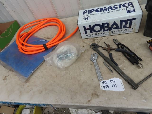 Battery Box, Welding Rods, Tarp, Air Hose, & Various Tools