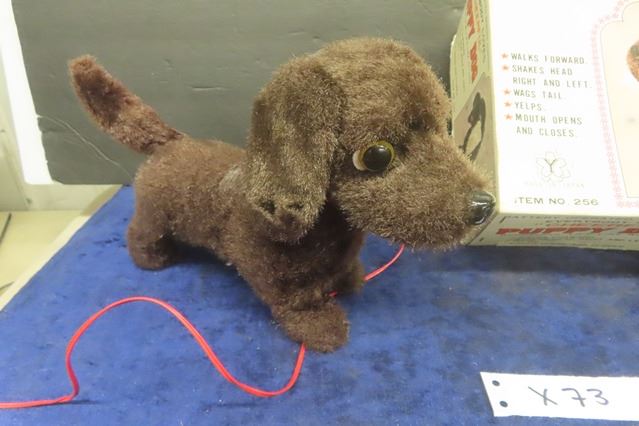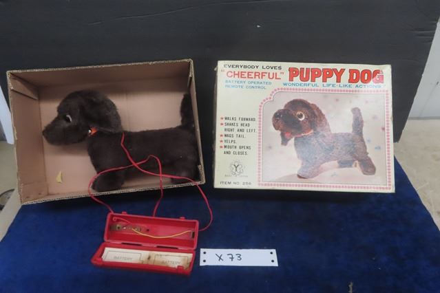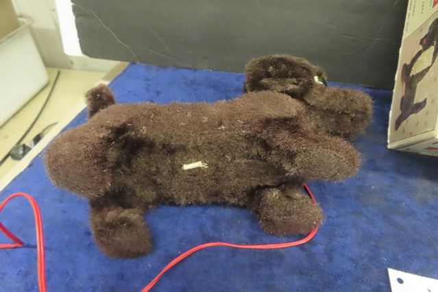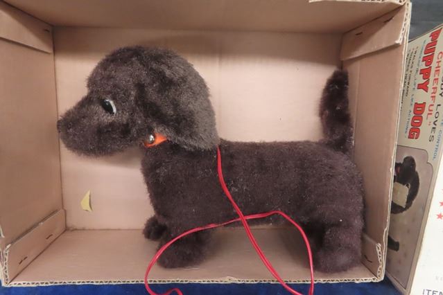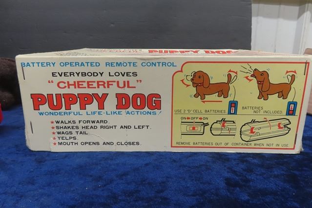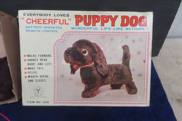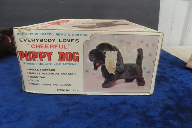 Battery Operated Cheerful Puppy Dog Fur Covered Tin Toy in Original Box - Made in Japan 9" Long