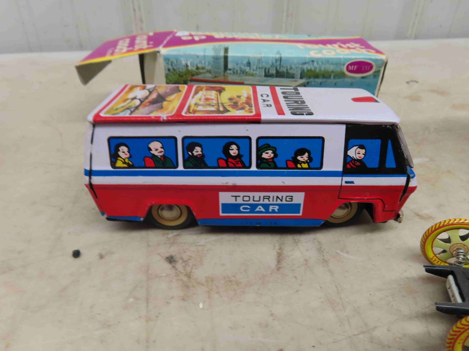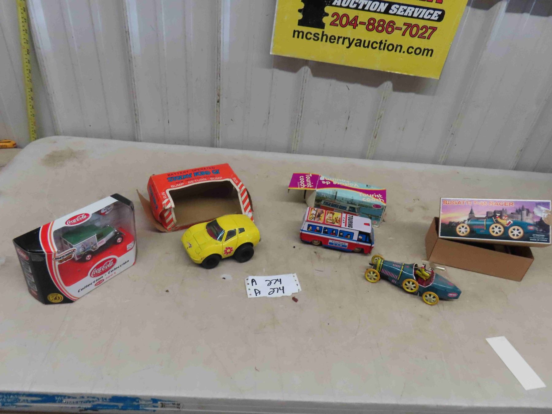 Battery Operated Stocky Ford, Coca-Cola Die Cast Delivery, Friction Tour Bus, Wind Up Car