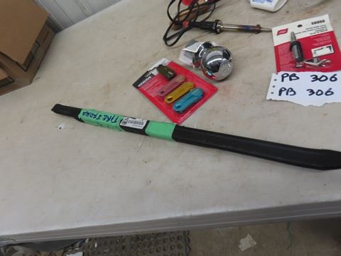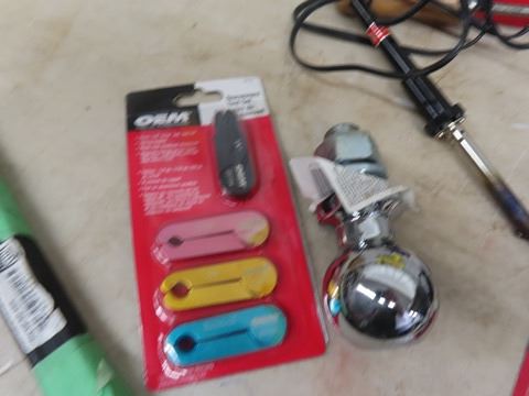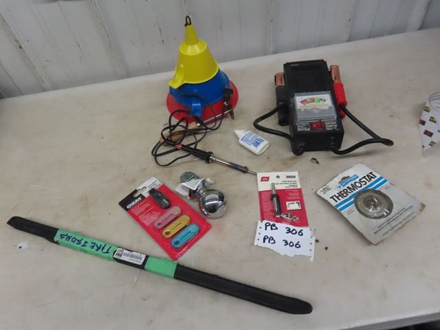 Battery Tester, 2 Tire Irons, Funnels, 2 5/16" Ball Hitch, Disconnect Tool Set - Most New, some Used
