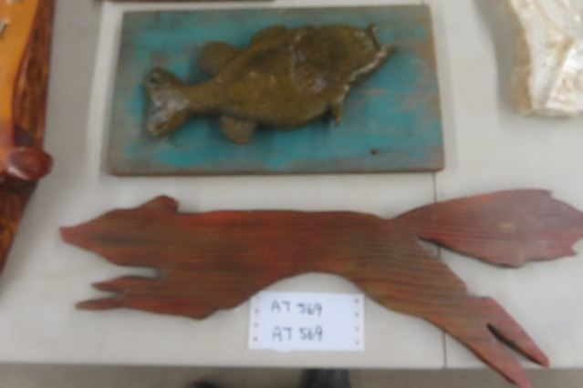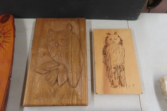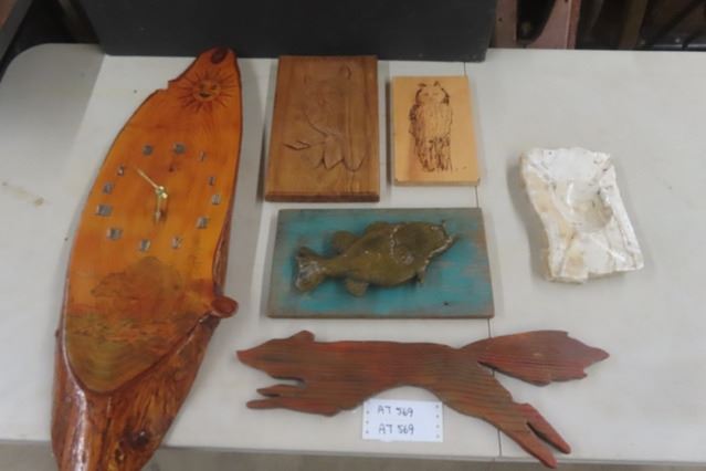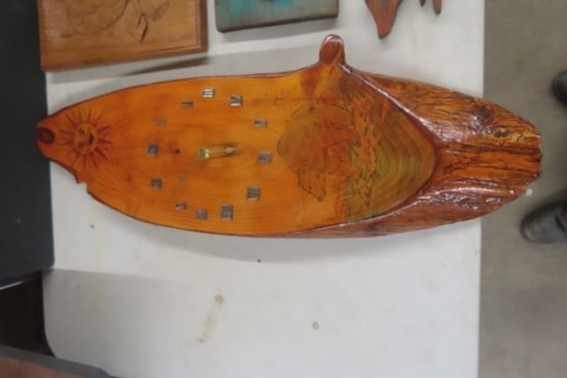 Bear on Wood Clock, Carved Owls, Carved Fish on Wood, Marble Ashtray