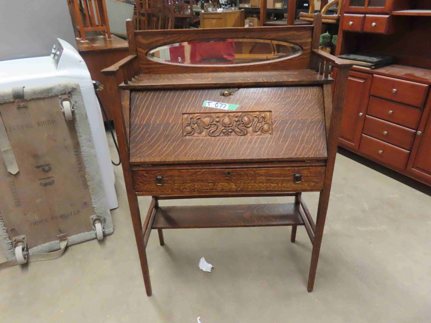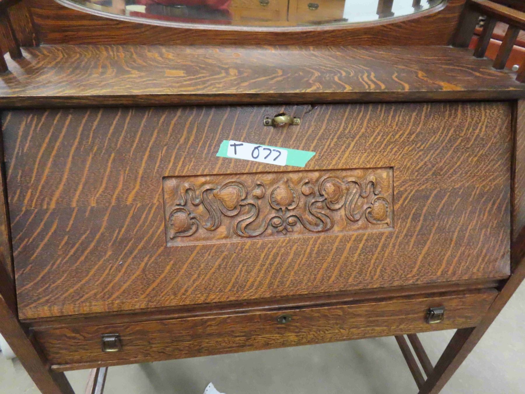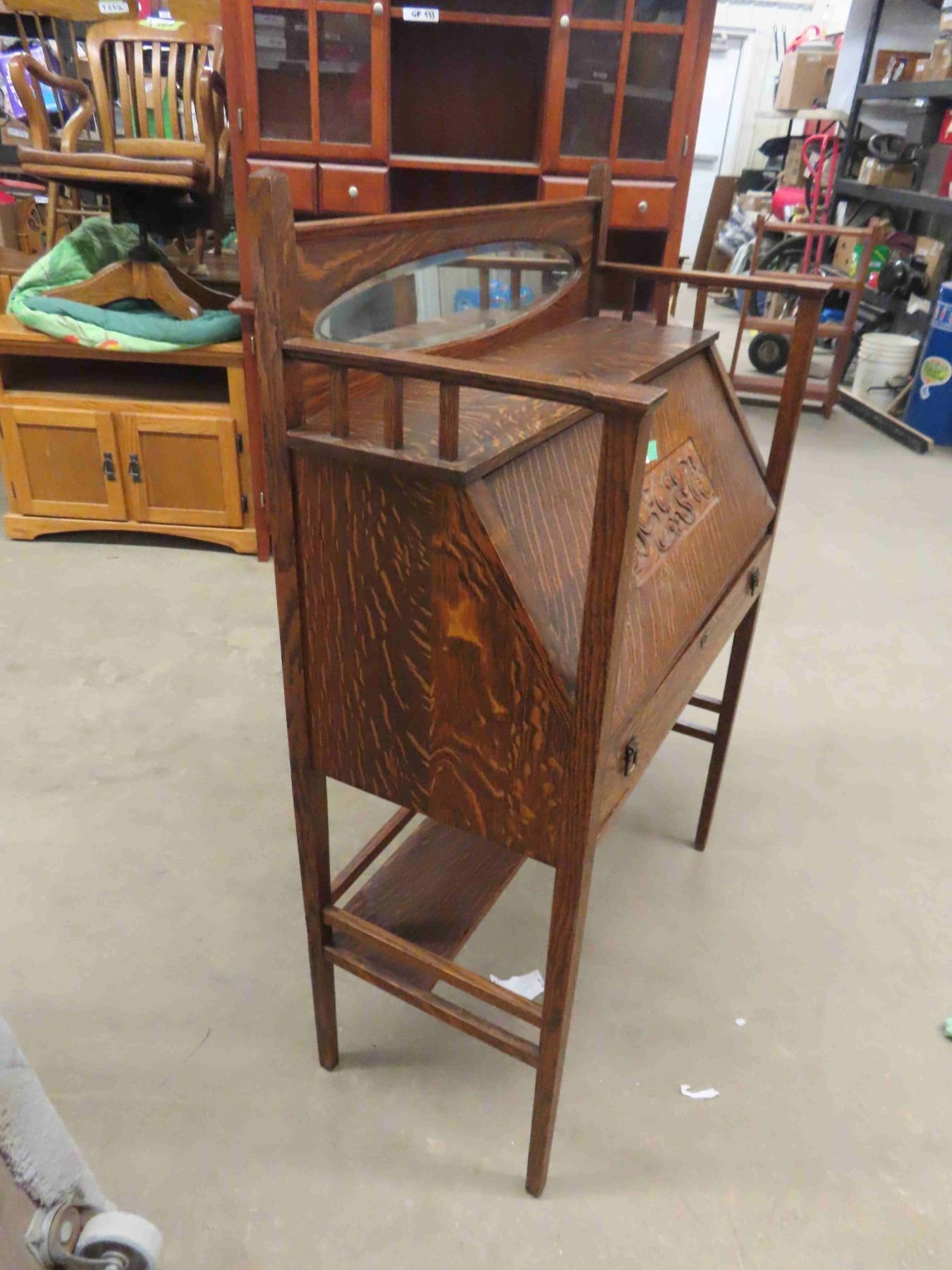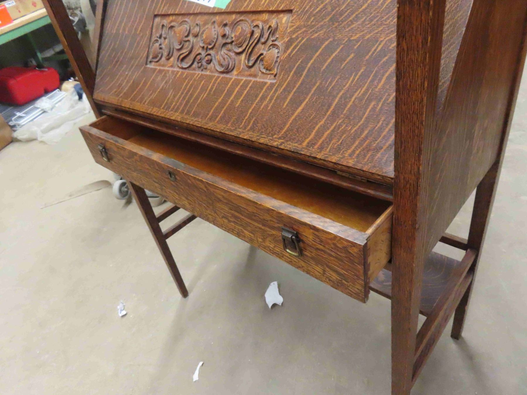 Beautiful Vintage Antique Upright Desk - I believe to be an England Arts & Crafts style with exquisite hand carving on the front door that folds down into the desk. fumed oak finish, I mean the real fumed oak, not the kind that is painted on. It also has a small mirror on the top. I believe this piece to be at least 100 years old. 48” tall, 37” wide and 16” deep. WOW!