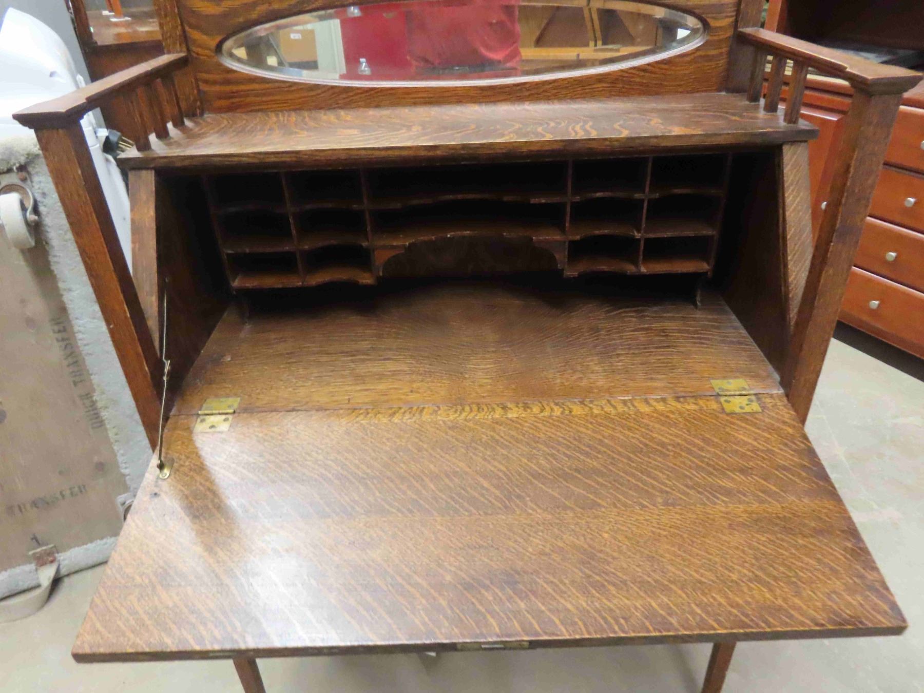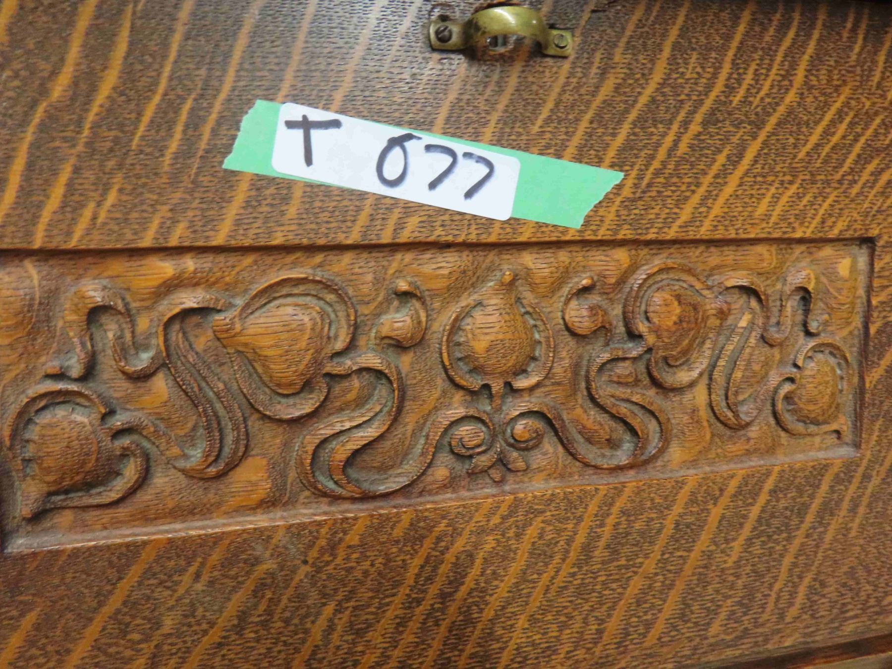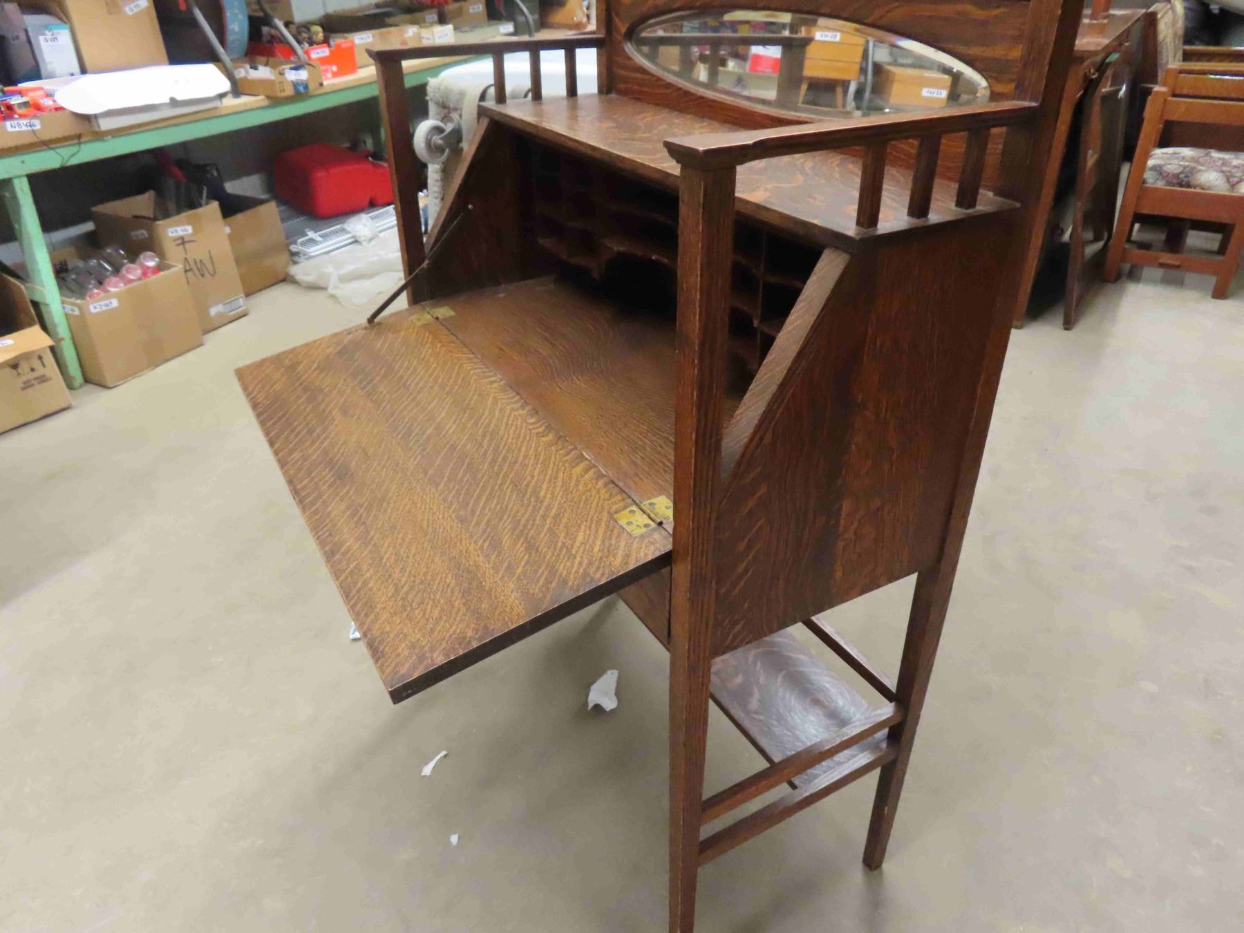 Beautiful Vintage Antique Upright Desk - I believe to be an England Arts & Crafts style with exquisite hand carving on the front door that folds down into the desk. fumed oak finish, I mean the real fumed oak, not the kind that is painted on. It also has a small mirror on the top. I believe this piece to be at least 100 years old. 48” tall, 37” wide and 16” deep. WOW!