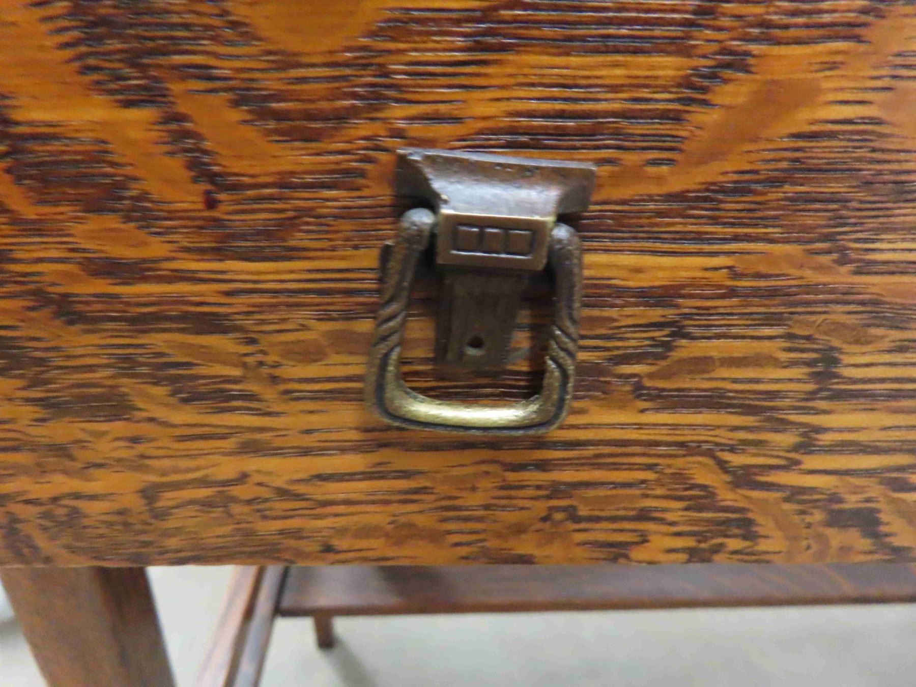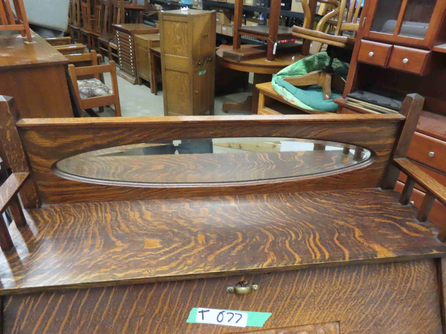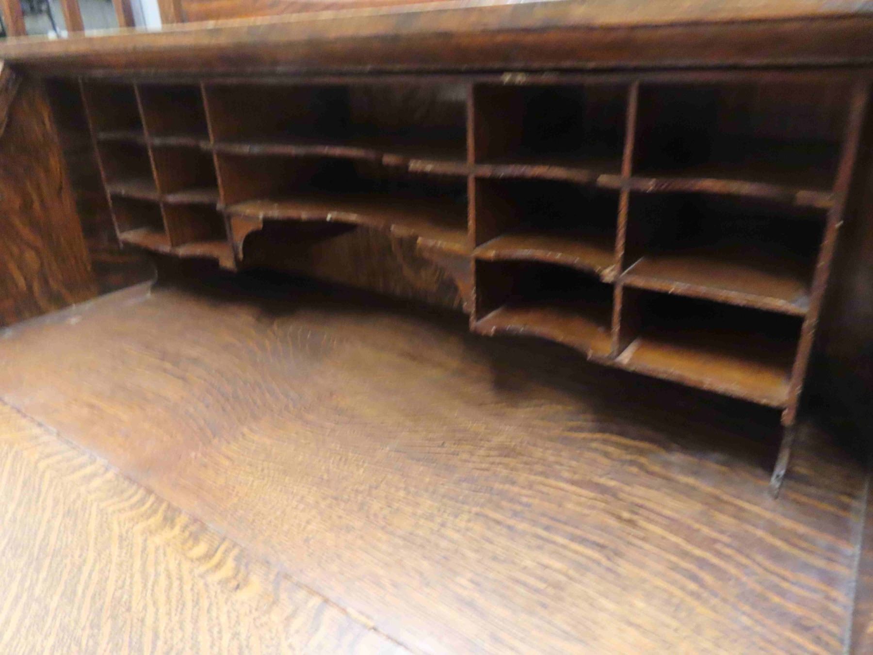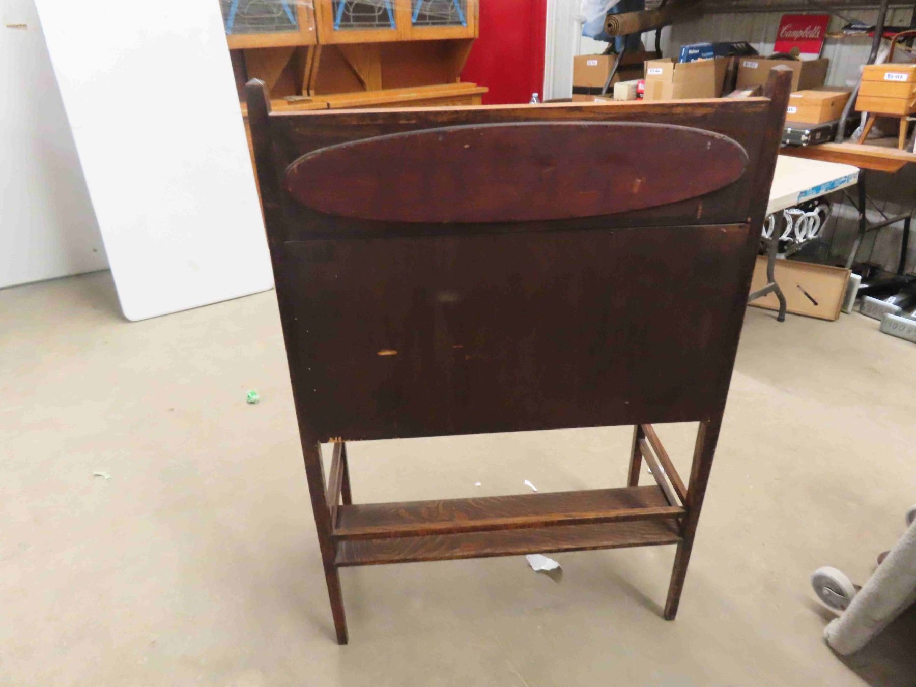 Beautiful Vintage Antique Upright Desk - I believe to be an England Arts & Crafts style with exquisite hand carving on the front door that folds down into the desk. fumed oak finish, I mean the real fumed oak, not the kind that is painted on. It also has a small mirror on the top. I believe this piece to be at least 100 years old. 48” tall, 37” wide and 16” deep. WOW!