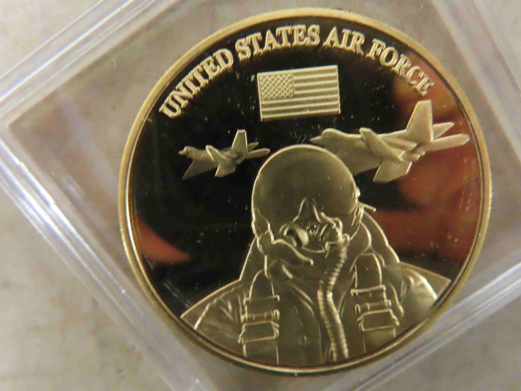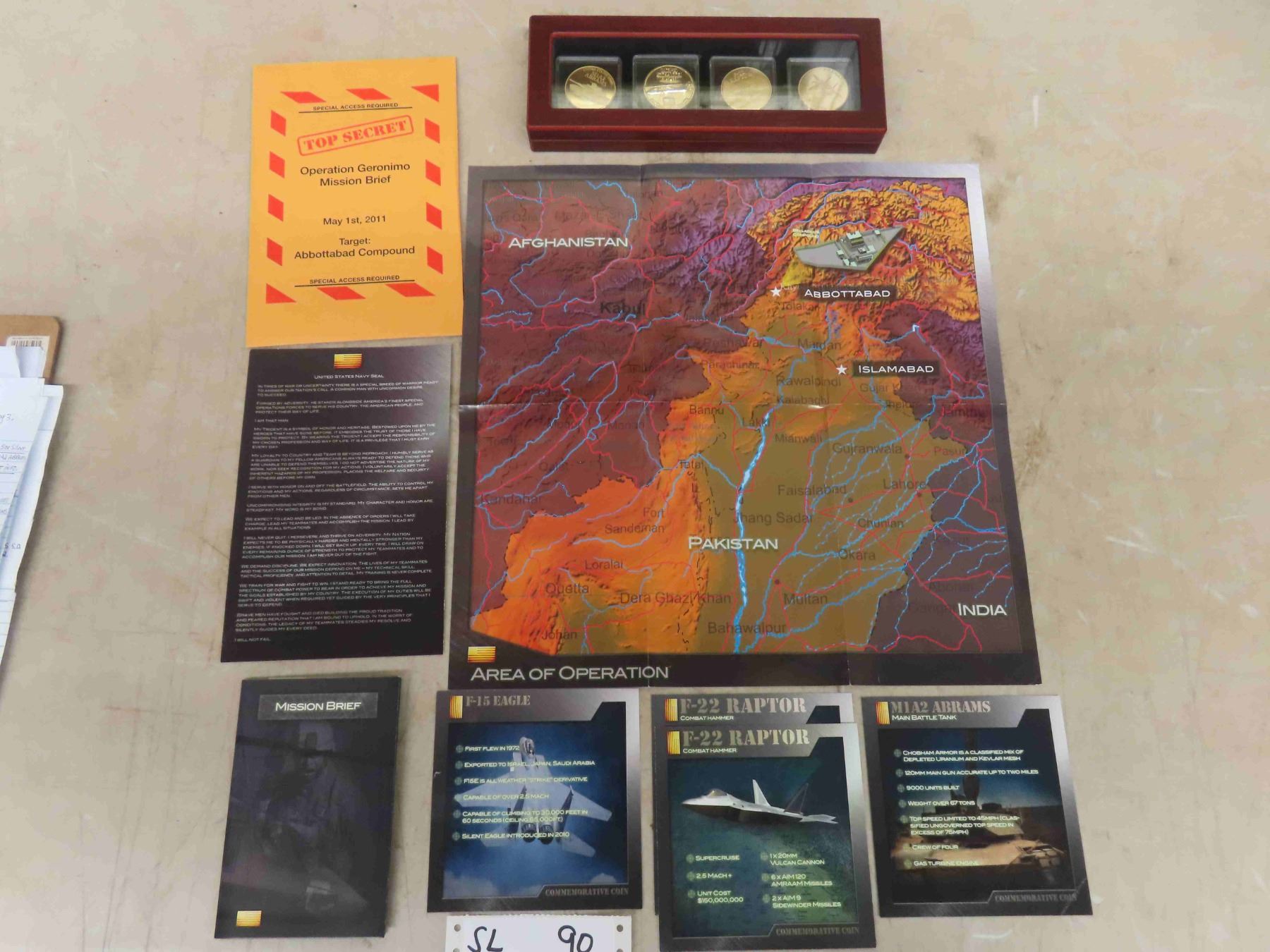 Beautiful Wood Display Case with 4 Limited Edition Gold Clad Coins , M1A2 Abrams Tank, MH-X Stealth Hawk, F-22 Raptor, F-15 Eagle with Photos & Top Secret Info