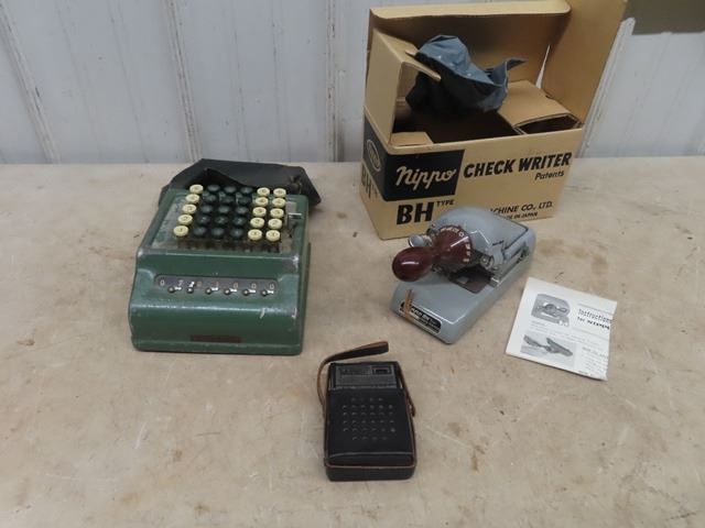 Bell Punch Company Adding Machine, Nippo New Old Strock Cheque Printing Machine w Box, & Mastercraft Transistor Radio