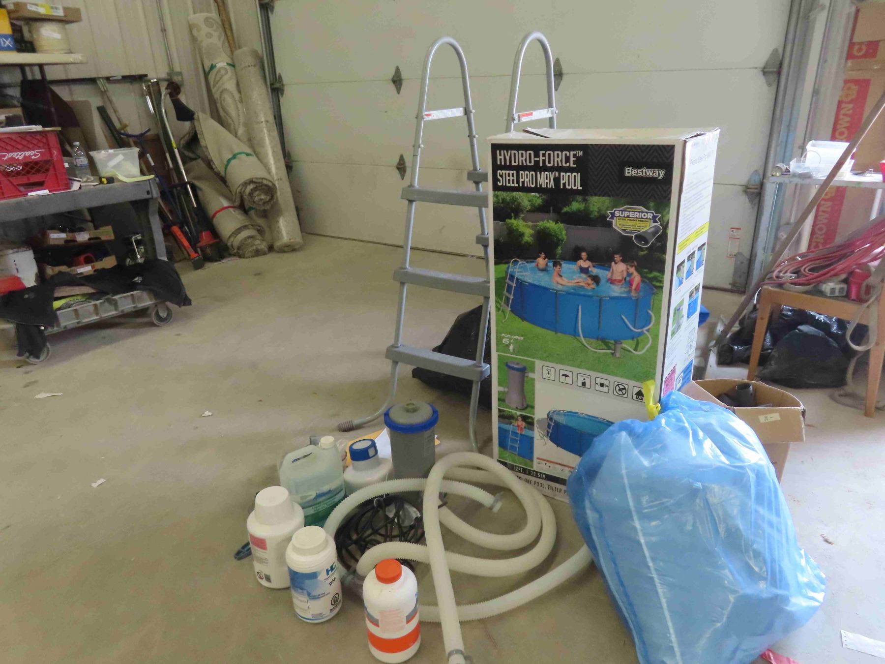 Bestway Hydro-Force Steel Pro Max Pool 12ft Across x 39.5'' Deep. Includes Liner, Pump (Needs Filter), Ladder, Solar Blanket, Chemicals. Only Used for 2 Seasons.