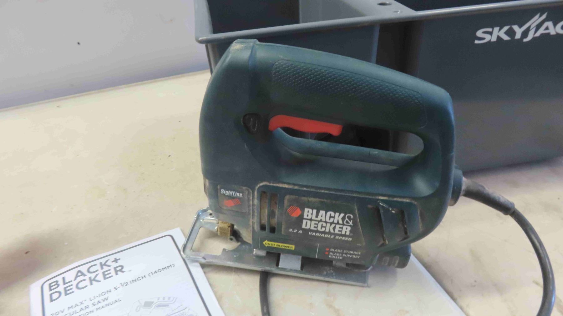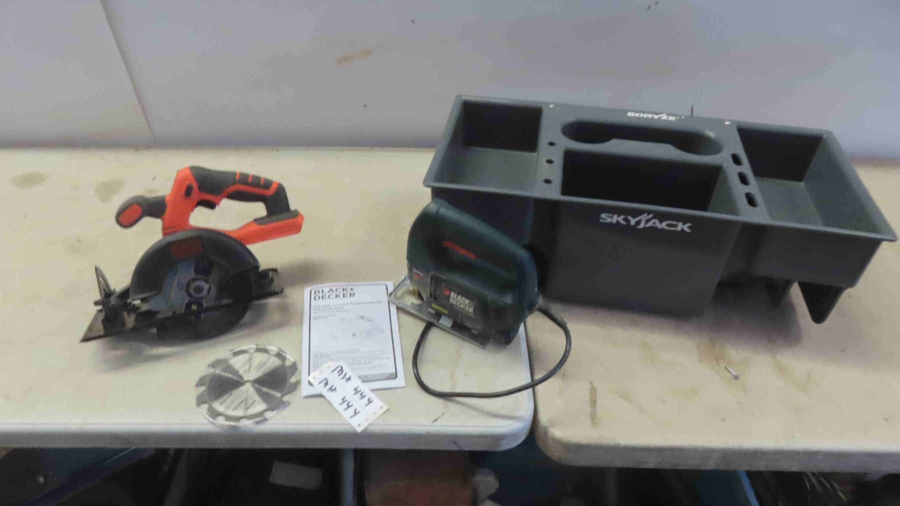 Black and Decker 20V 5 1/2'' Circular Saw, Black and Decker 3.2 Amp Variable Speed Jig Saw, Soryze SkyJack Tool Caddy