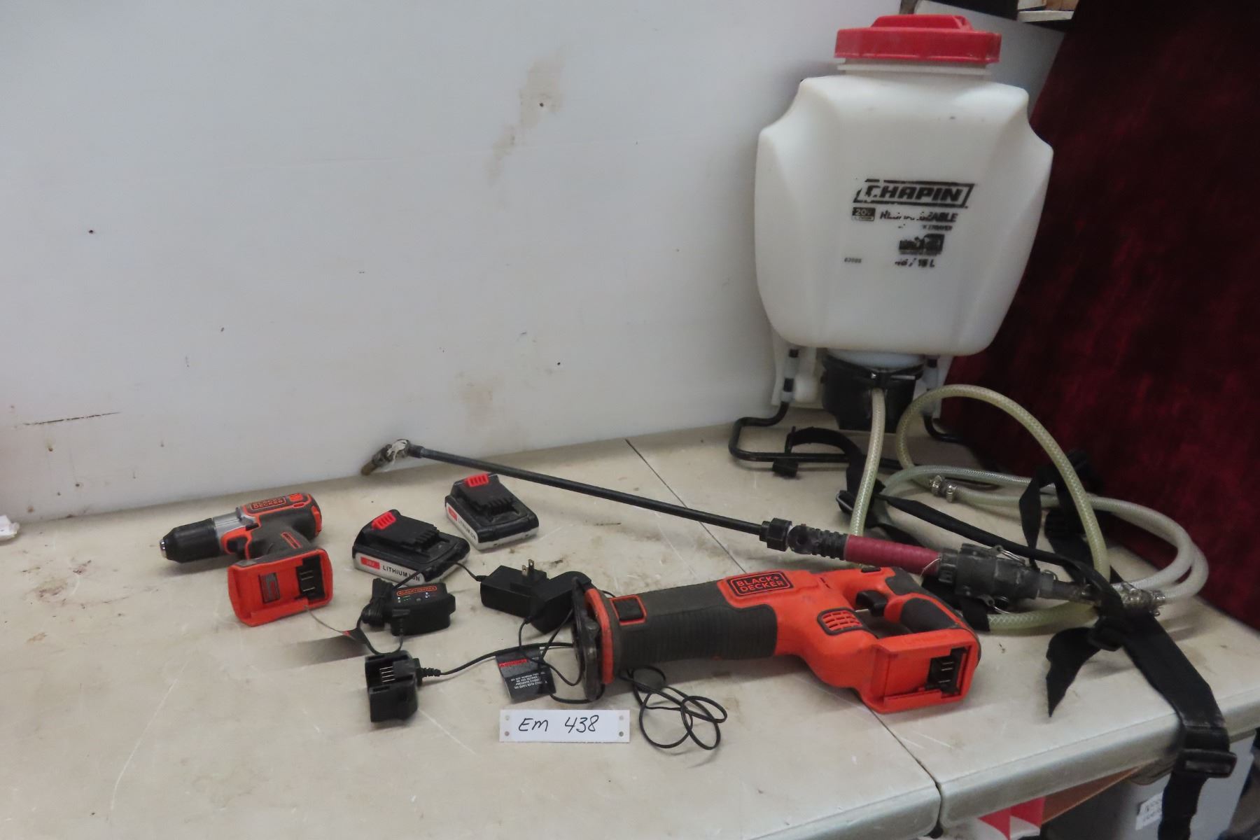 Black and Decker 20V Cordless Recip Saw, Drill, 2 Chargers, Batteries and Chapin Backpack Sprayer -