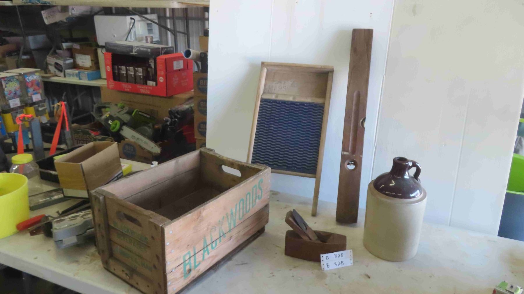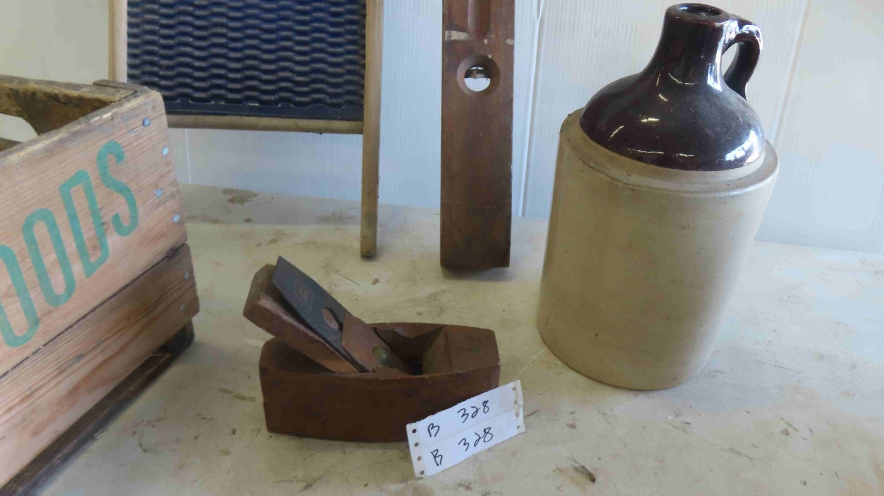 Blackwoods Crate , Porcelain Washboard, 1 Gallon Stoneware Jug, Wood Level, Planer