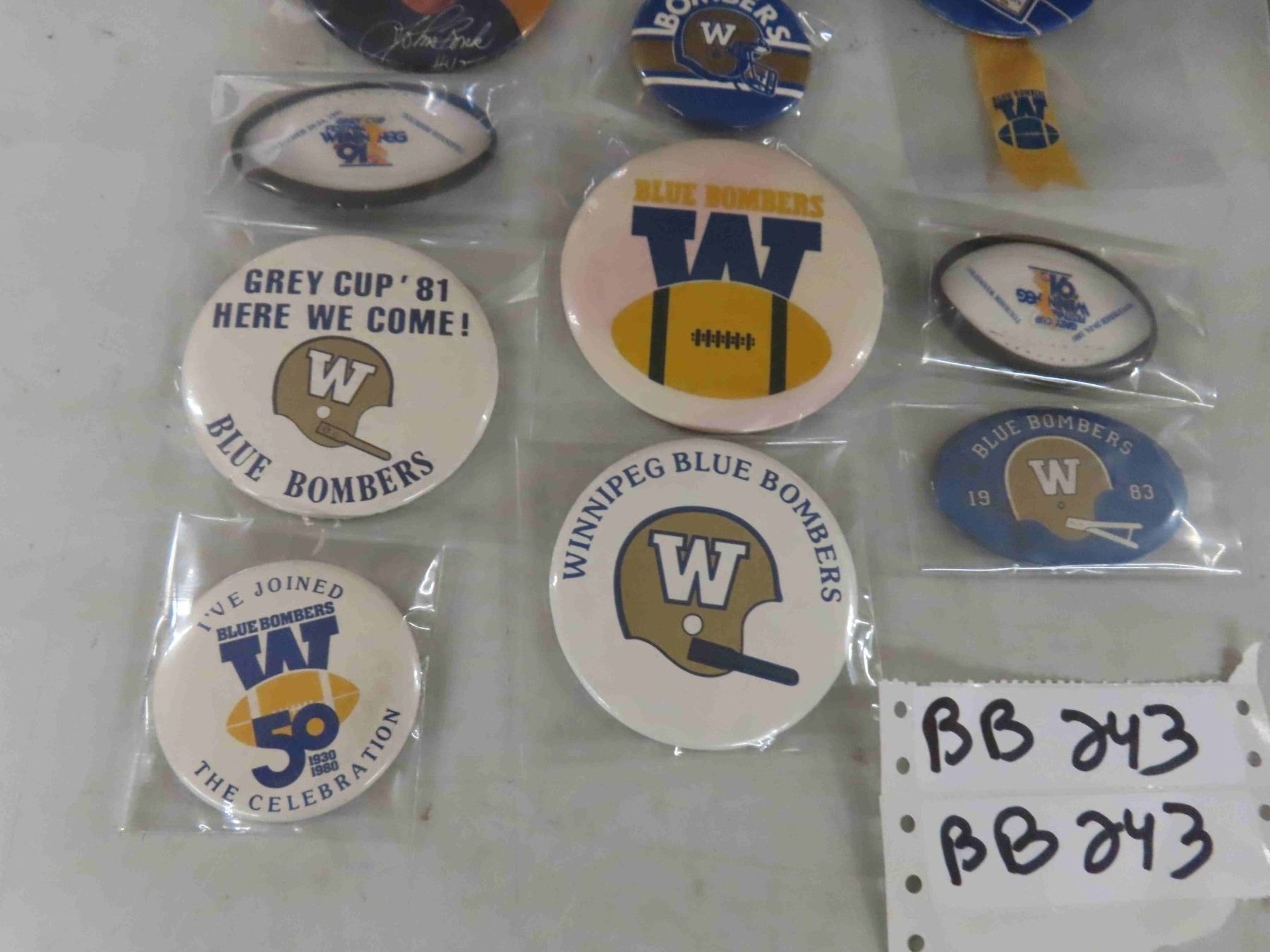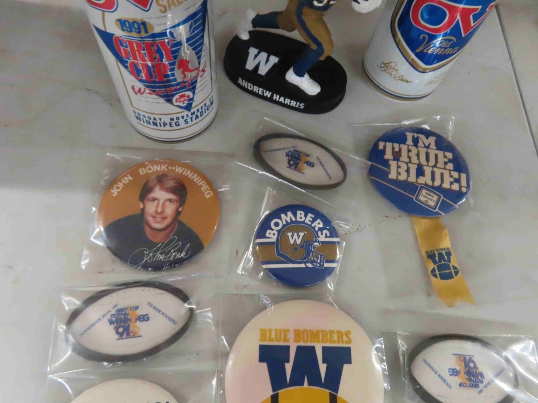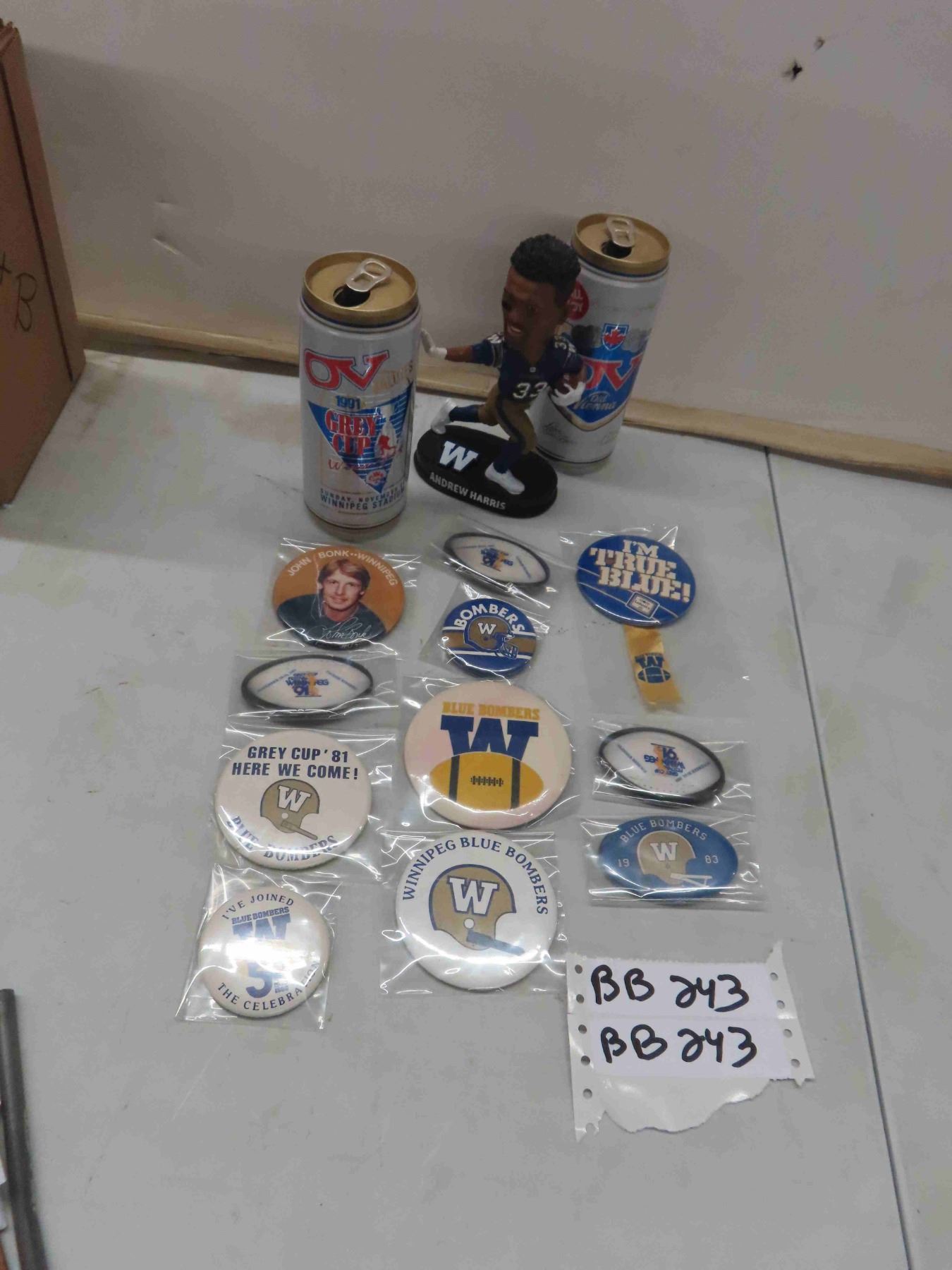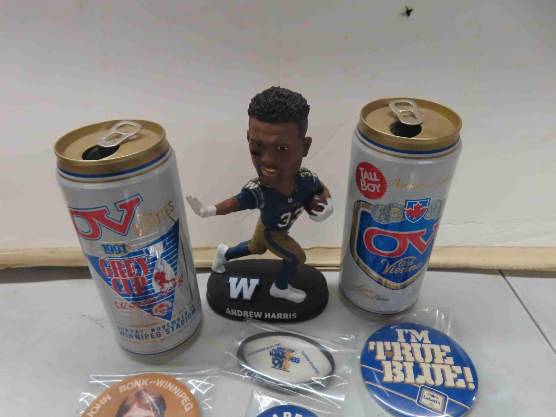 Blue Bombers Collection : Andrew Harris Bobble Head , 11 Very Old Bombers Buttons , 2 Beer Cans , 1991 Grey Cups in Winnipeg Stadium